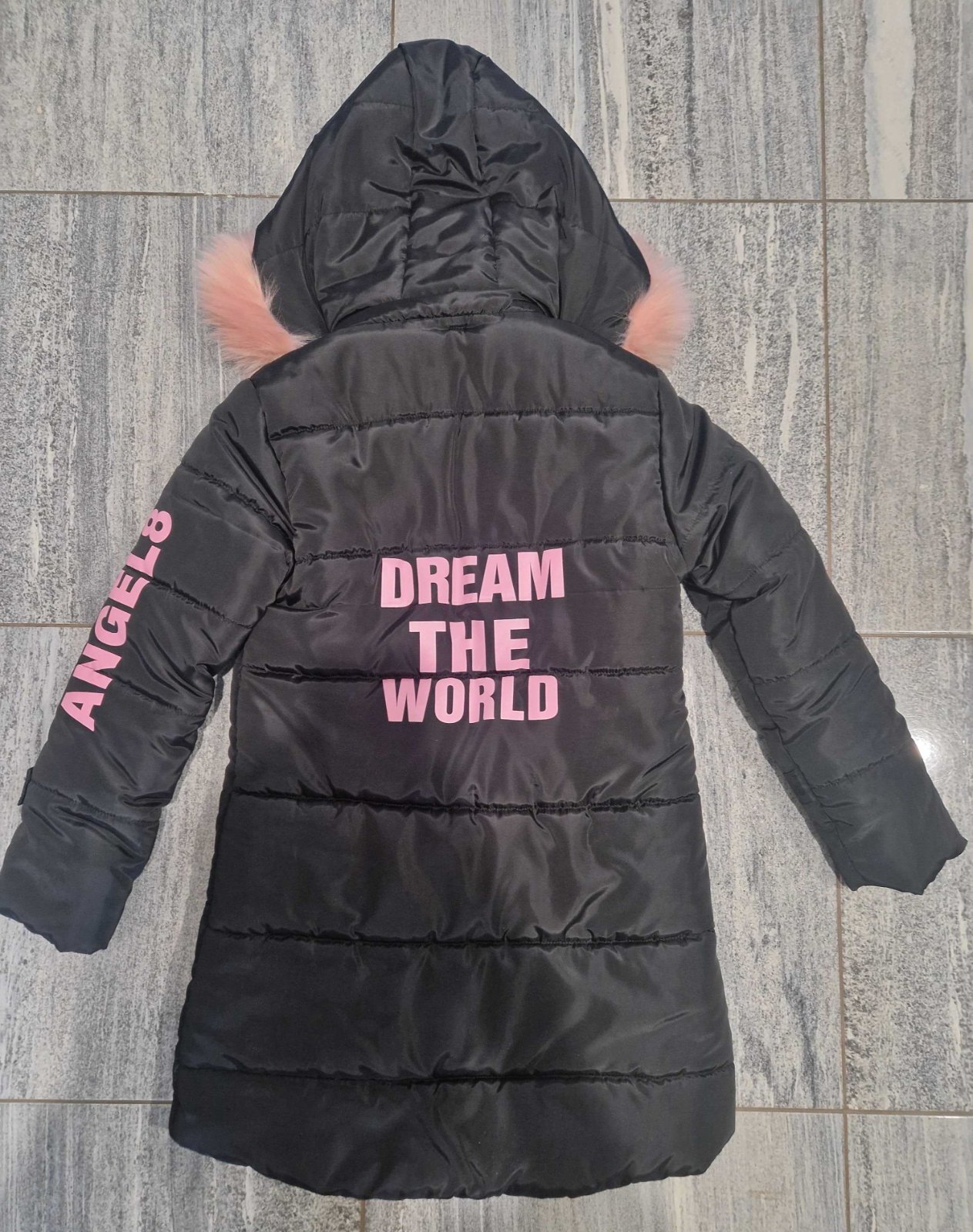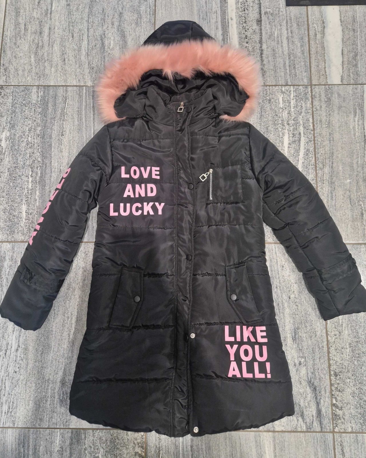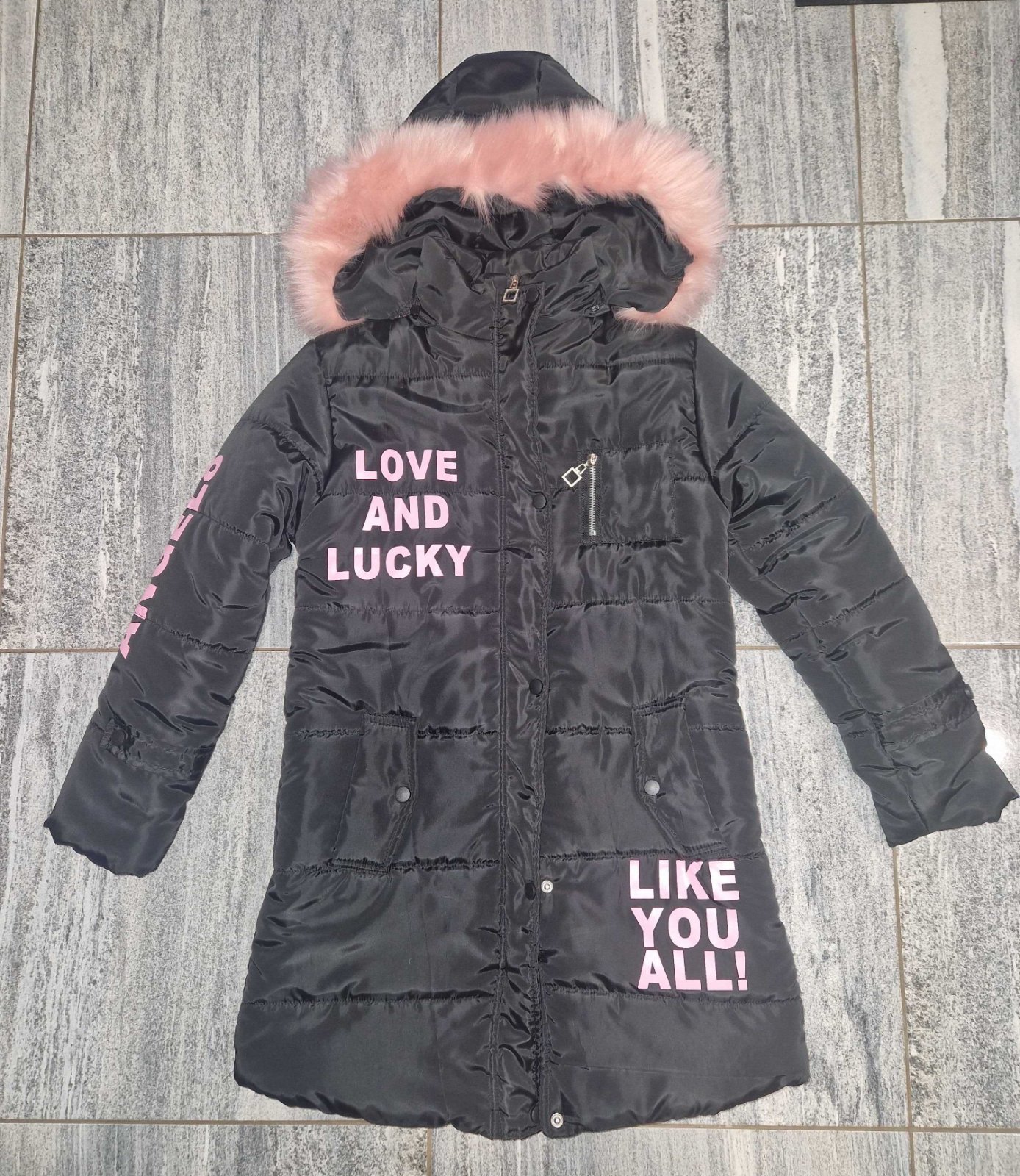 Krásny a štýlový dievčenský kabát s kožušinovou kapucňou a ružovými nápismi. Veľkosť písaná 150, ale sedí na menšiu veľkosť, dcéra mala iba 1x na sebe. Sadne skôr na 140/146