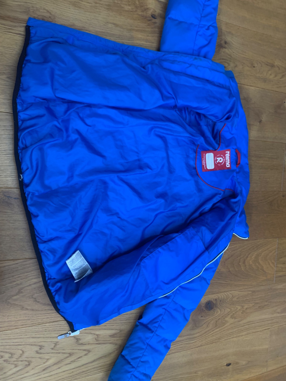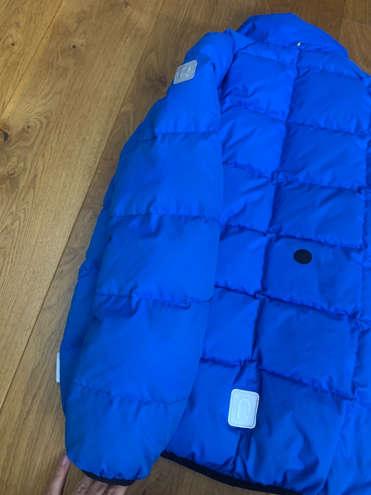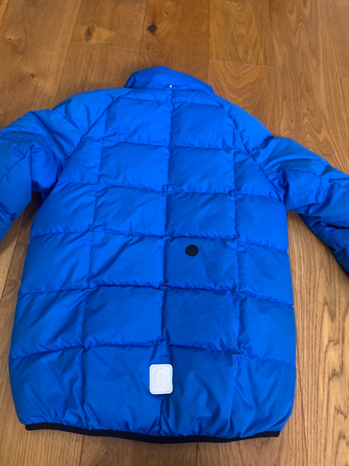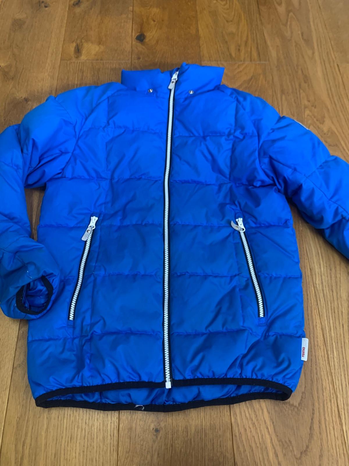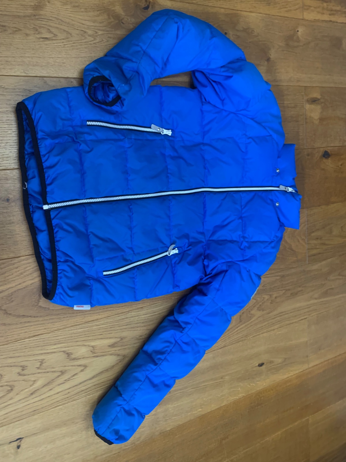 veľmi príjemná, makká, teplá, perie rozvrstvené rovnomerne, na rukáve nejaké fliačky, na zadnom diely opravená reima reoair kit-om, bez kapuce, sedí na 152 a 158