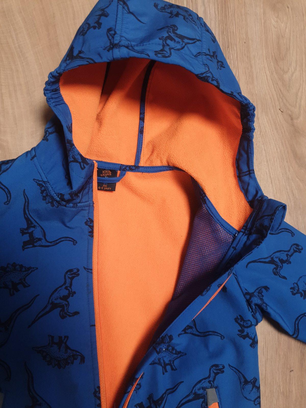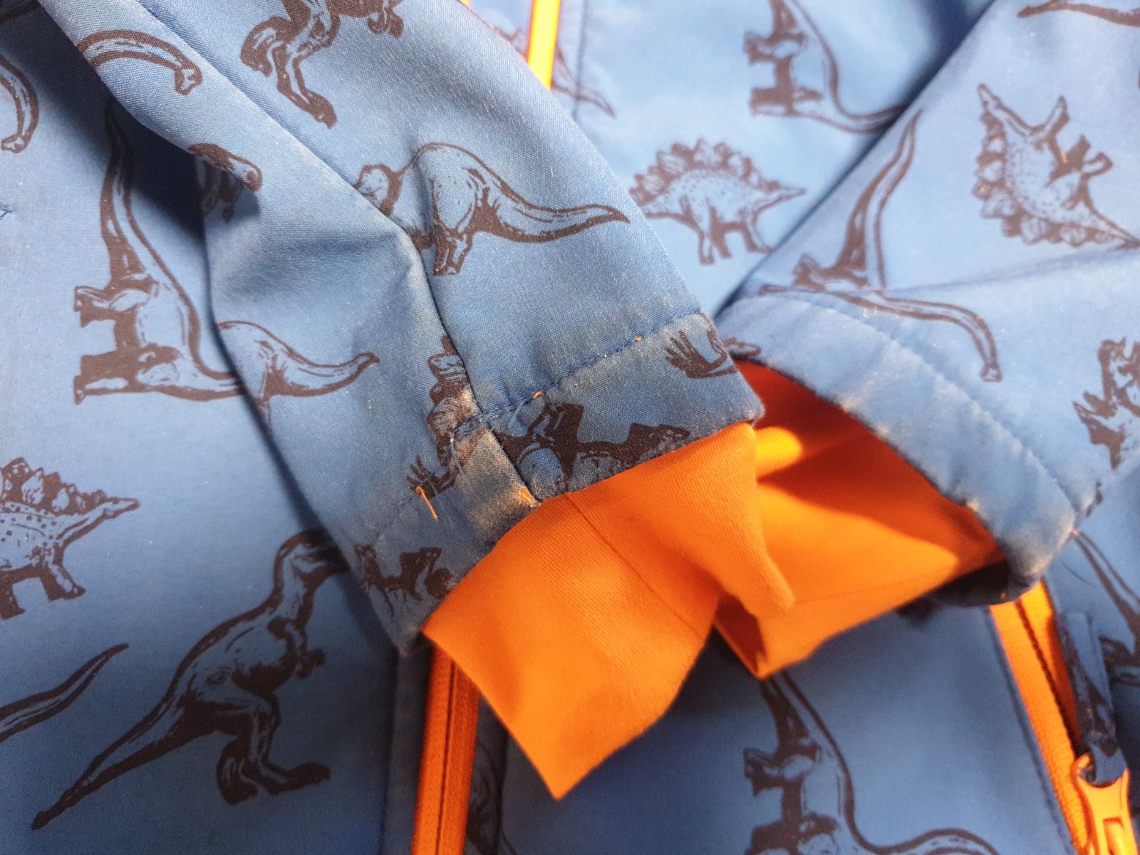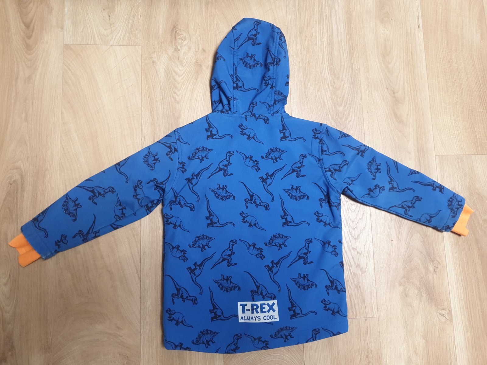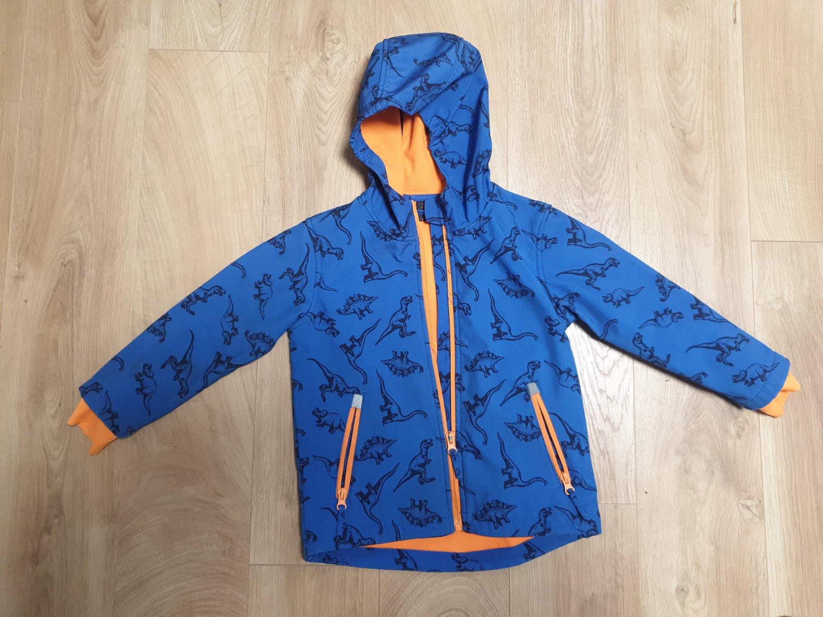 Na predaj krasna prechodna vetrovka v kombinacii modro-oranzovej farbe s dinosaurmi a reflexnymi prvkami