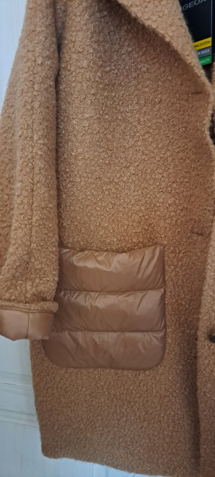 Krásna nová bunda značky GEOX. Veľkosť 44, karamelová farba. Je Krásna!!! Rozmery: celková dĺžka 98 cm, v podpaží 2x66 cm. Fotka na modelke slúži na ilustráciu. Nový stál 299€.