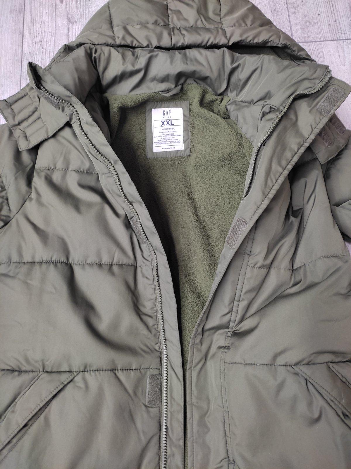 Predám jednu zimu nosenú bundu značky GAP. Veľkosť uvedená na 160 cm, ale je aj 164. Je to najvačšia detská veľkosť značky Gap XXL. Bunda bola 1x oprana. Bez poškodení. Rozmery: širka pod pazuchami: 54 cm, dľžka: 71 cm. Rukáv od ramena: 59 cm.