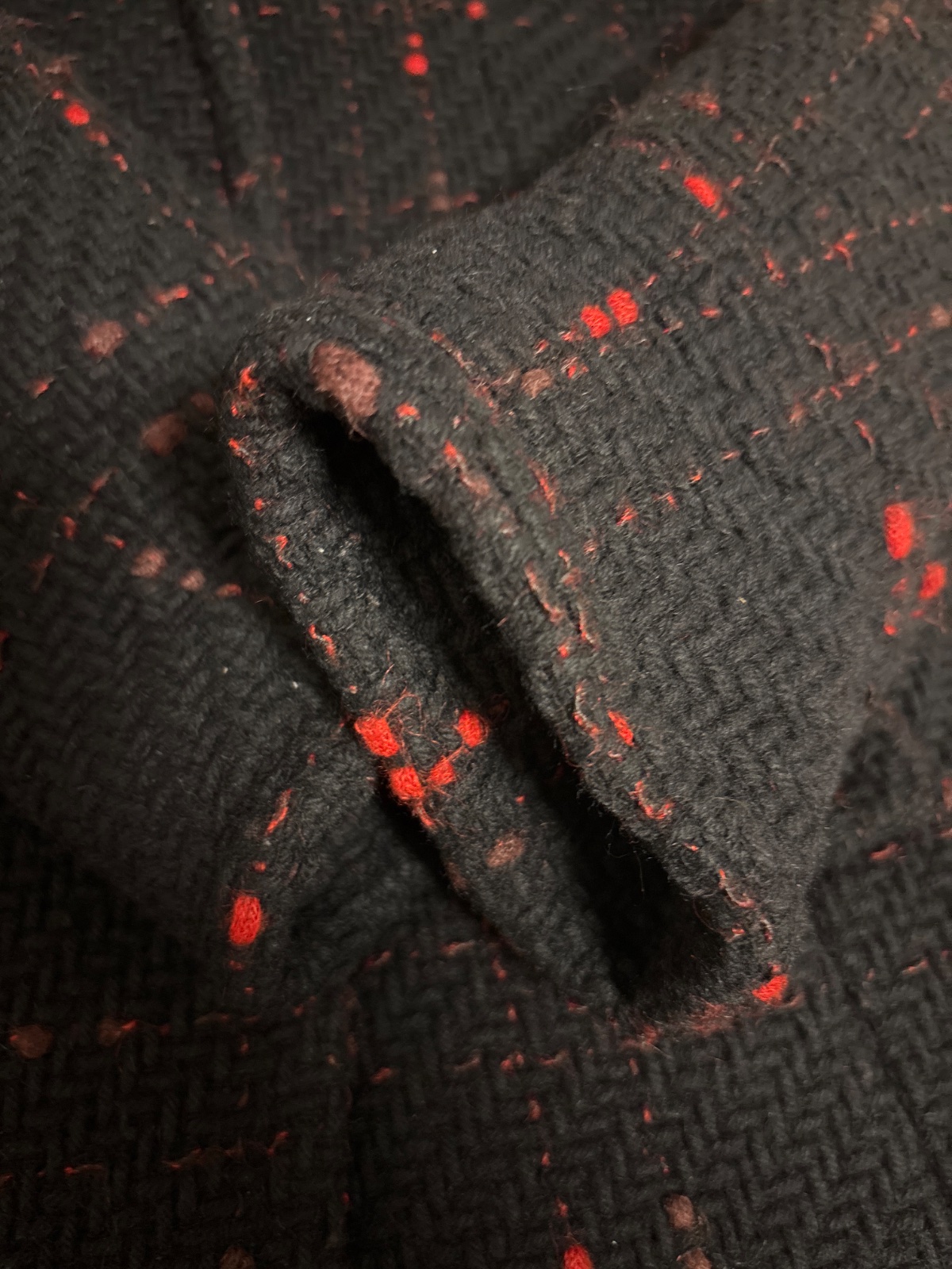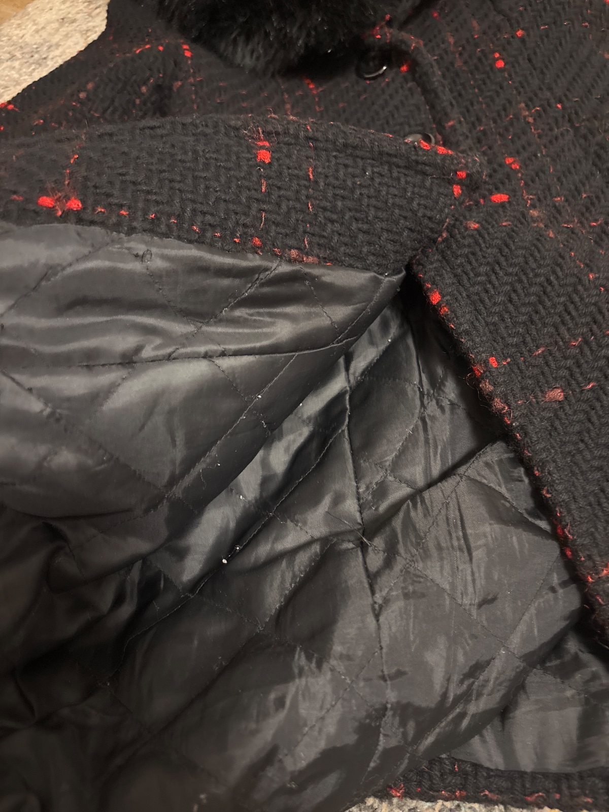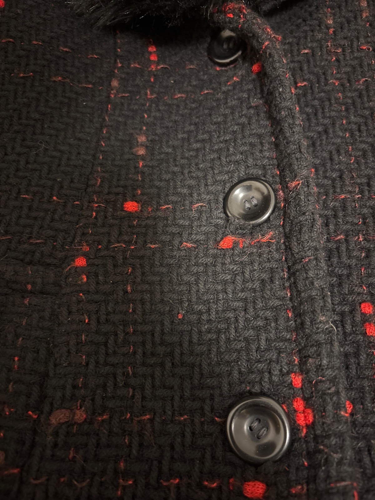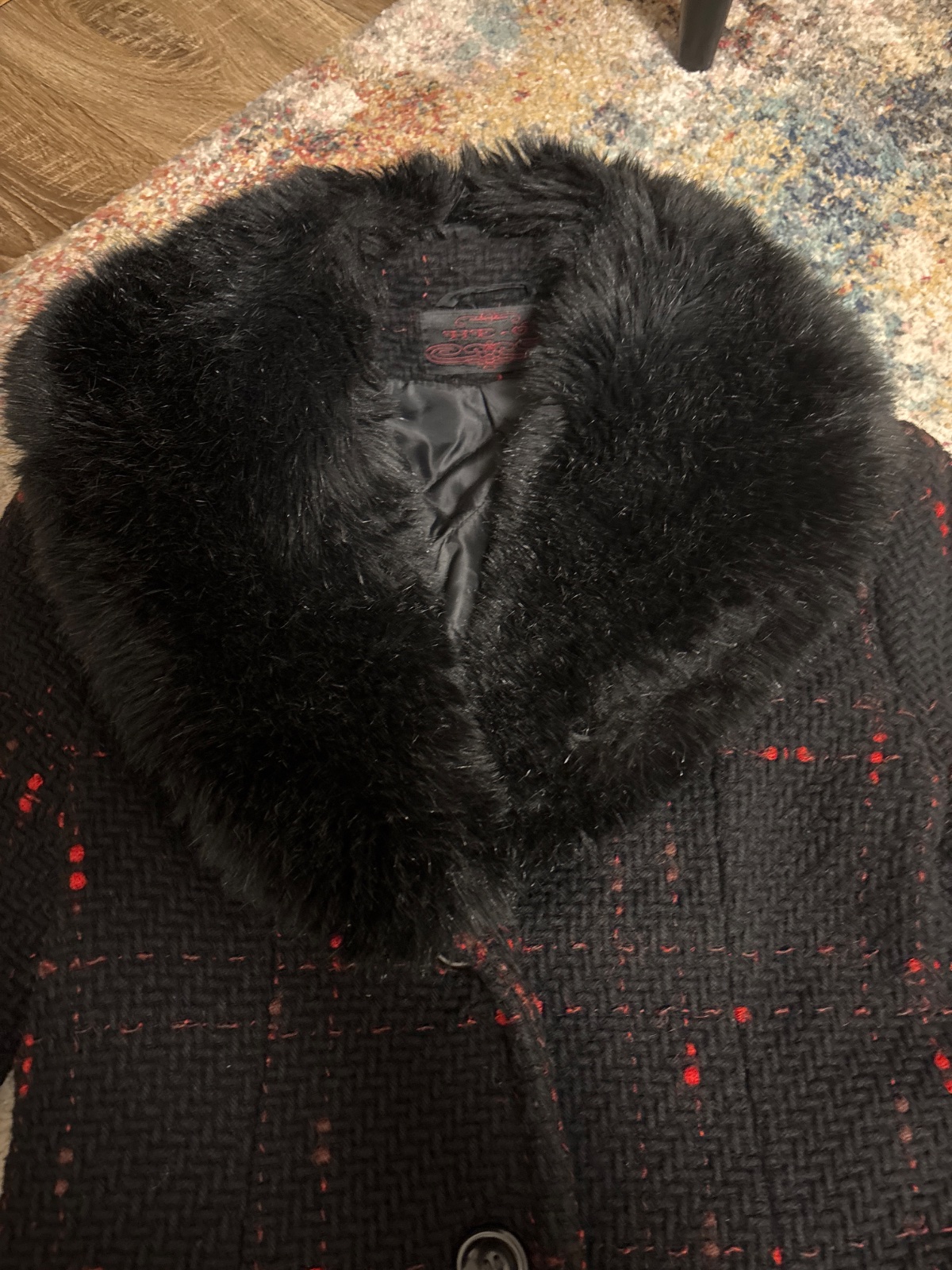 Predam teplý spolocenský kabát s odnimatelnou kozusinou . Top stav , velmi pekne tvaruje postavu , dlzka 79cm, sirka pod pazuchami 46cm, rukav od krku 76cm . Cierna farba s jemnym cervenym presitim .