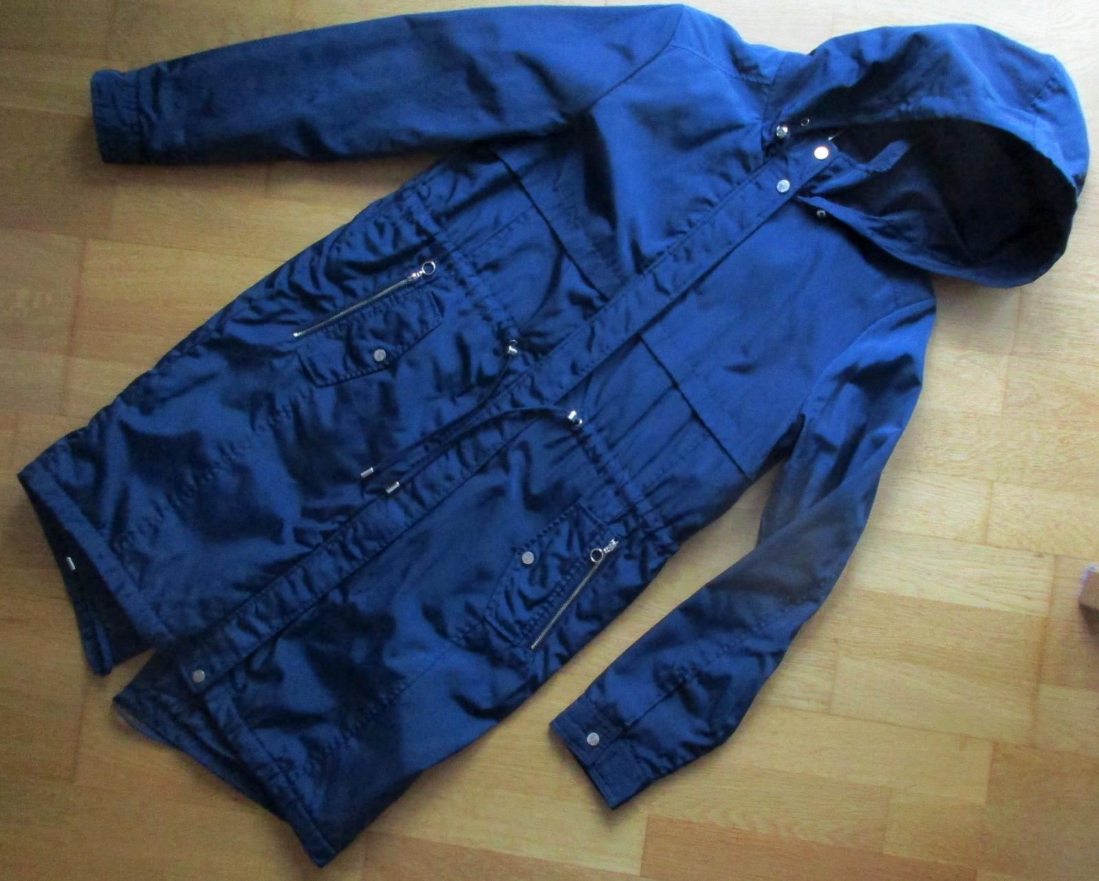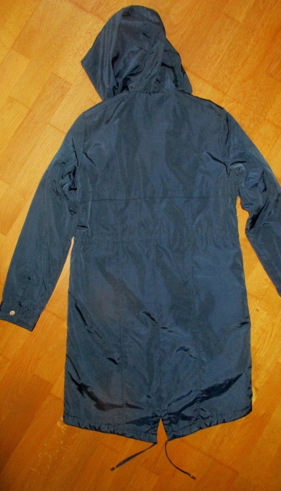 Parkrat nosena vetrovka znacky House, Hrubsi sustiak tmavej modrej farby, podsita, vnutri zateplena. Bunda je velmi dlha, skoro ako kabat. Cvocky pri podrobnom skumani vyzeraju ako trochu osuchane, ale pri noseni to nie je napadne, neskusala som ich prelestit. Bunda je inak v bezchybnom stave. Pas sa da stiahnut olivkami, vrecka su na zips, Kapucna sa tiez da stiahnut olivkami na gumicke. Tenke vatovanie je v celej bunde, aj v rukavoch. Prieramok 13, rukav 65 cm, dlzka od pleca vpredu 93, vzadu az 100 cmm, pas cca 2x54 cm,