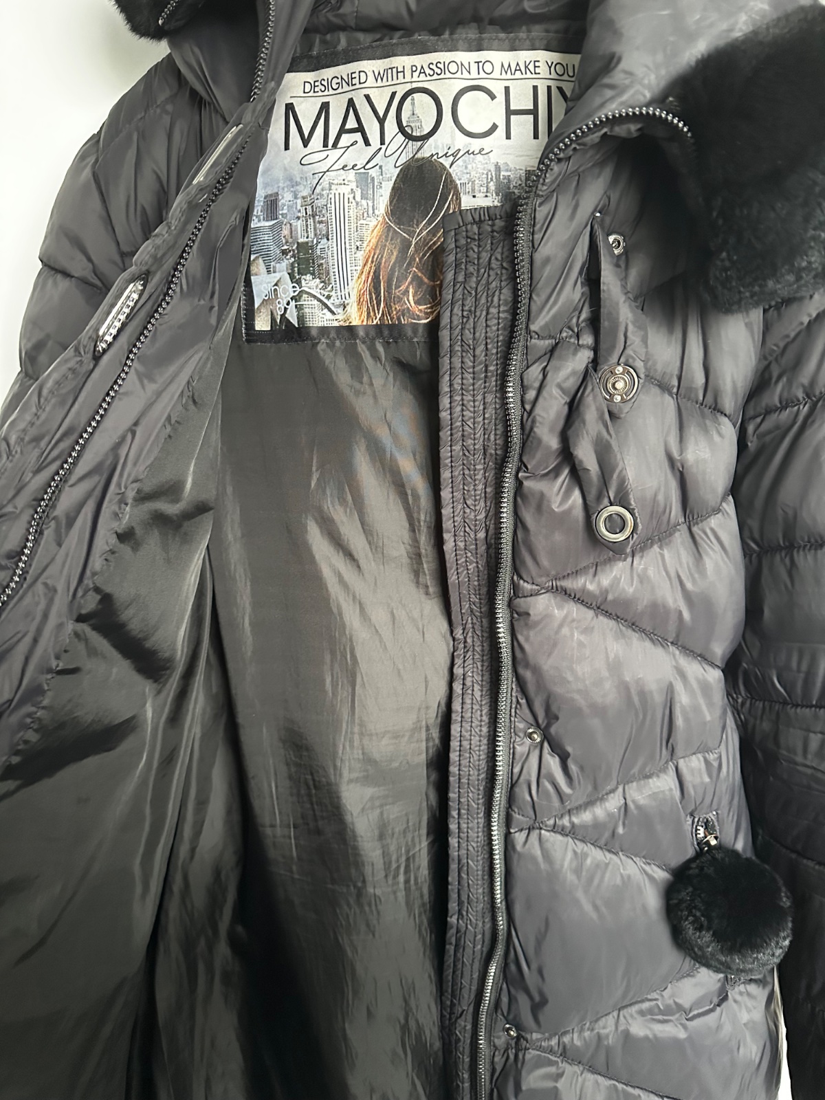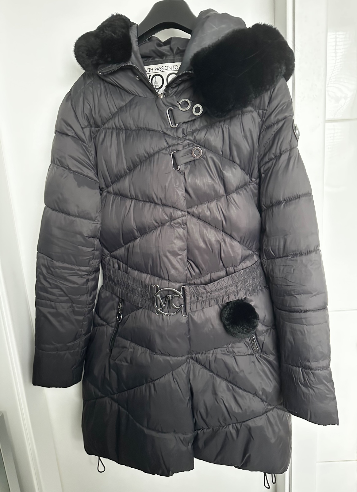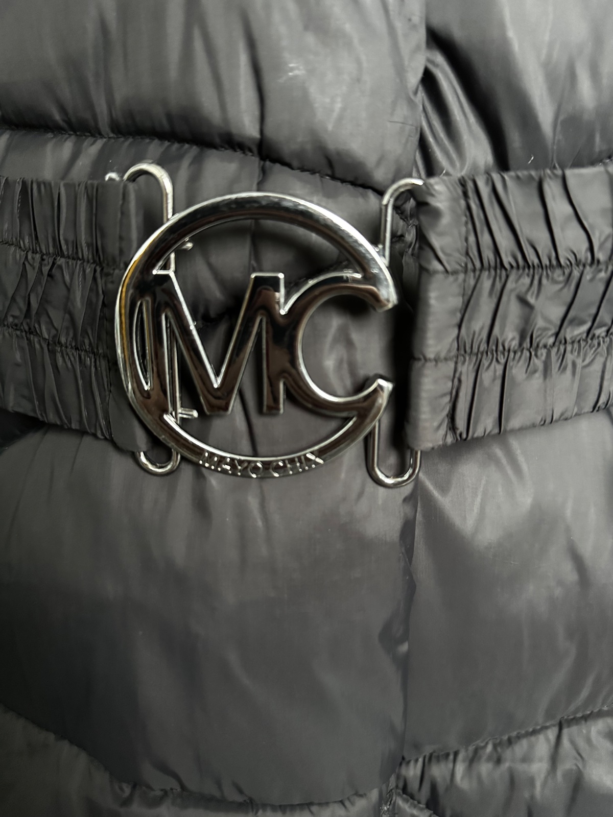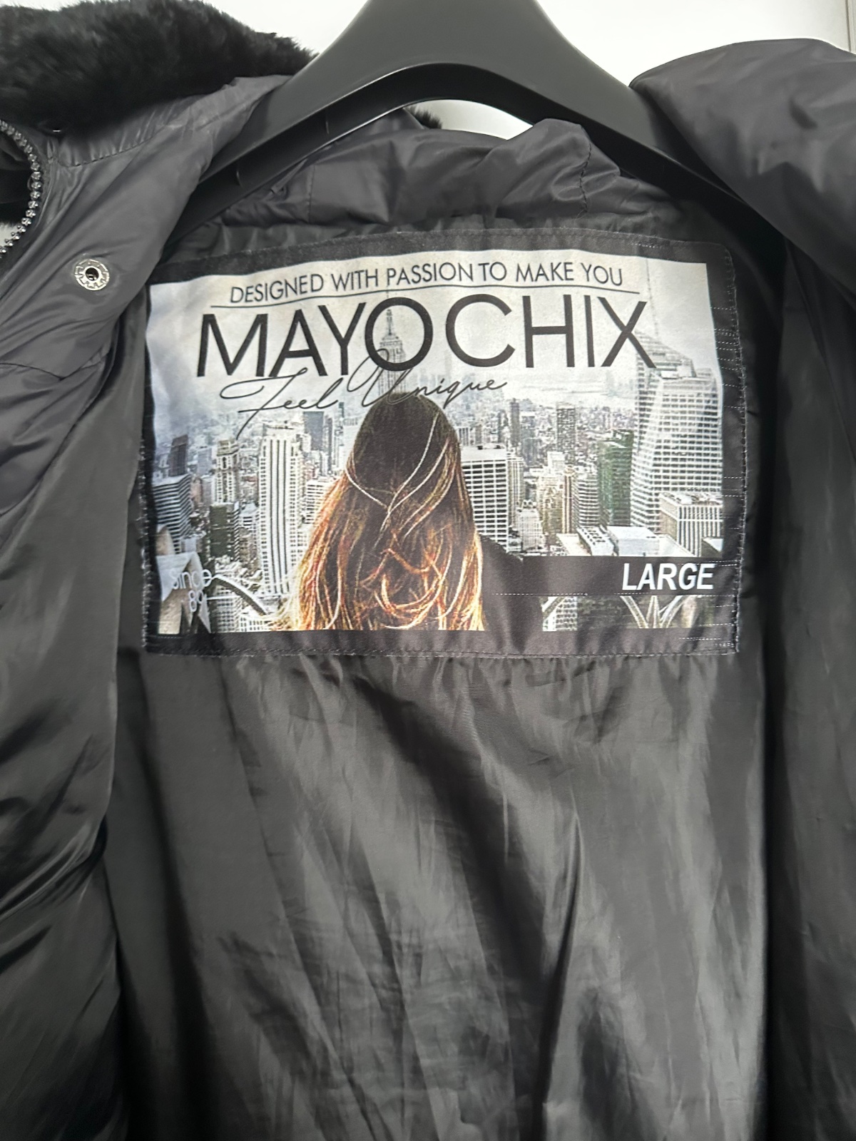 Predám štýlovú a teplú zimnú bundu od značky MAYOCHIX v elegantnej čiernej farbe. Je vybavená kapucňou s bohatou a príjemnou čiernou umelou kožušinou. V páse sa nachádza elastický opasok s výraznou kovovou prackou s logom "MC", ktorá bunde dodáva luxusný nádych, doplnený o strieborné kovové detaily a logo na rukáve. Bunda je vo výbornom stave, bola nosená minimálne, a jej pôvodná cena bola 190€. Na poslednej fotke sa nachádza menšie poškodenie, ktoré nie je viditeľné pri nosení.