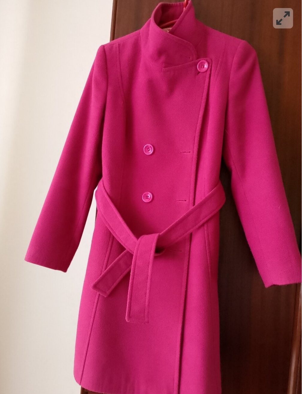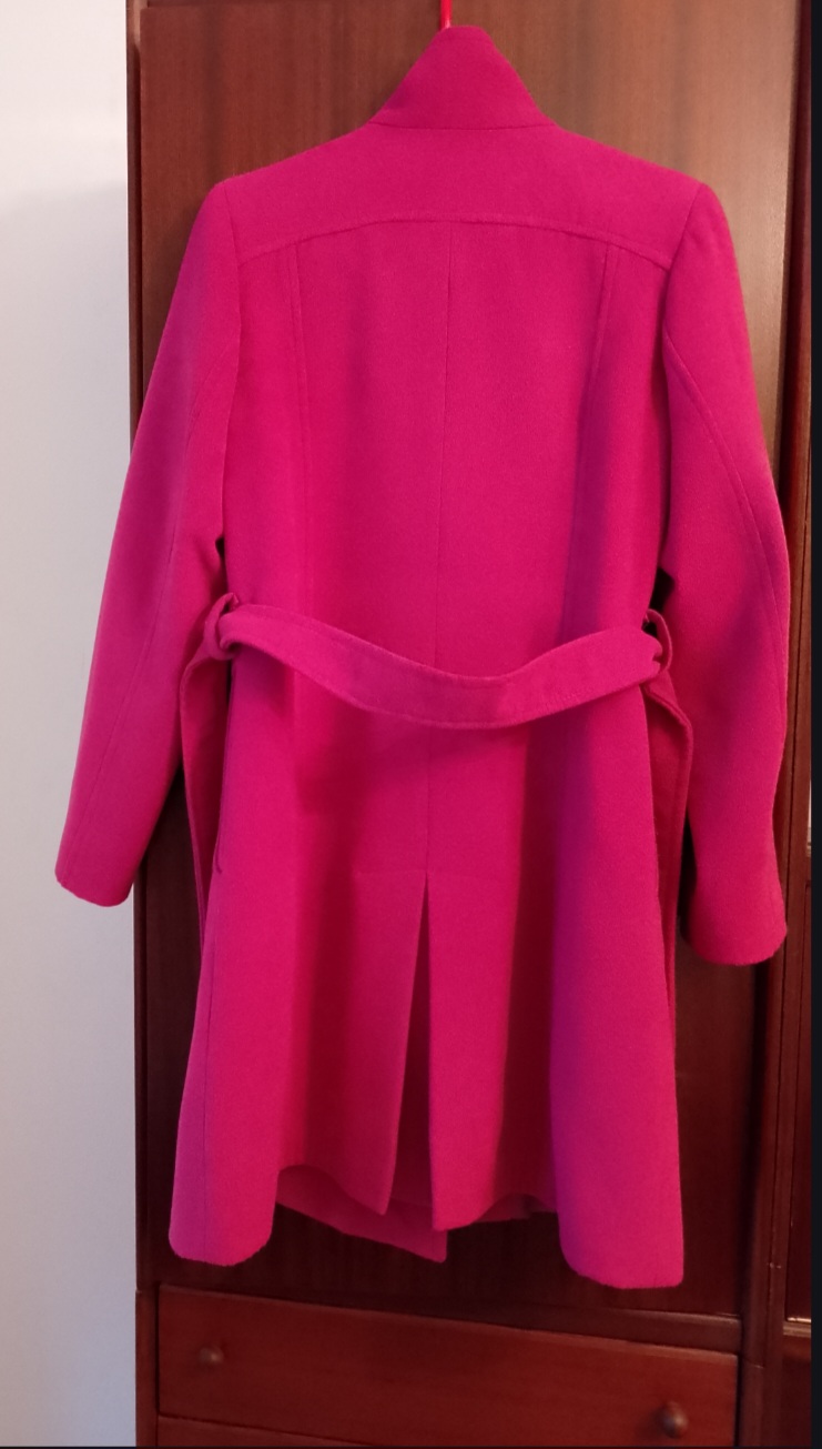 Pekný ružový kabát pre štíhlu ženu, dievča pod kolená, cislo od 38 po 40, má dvojradove zapínanie, opasok, gólier ku krku a pekne tvaruje postavu