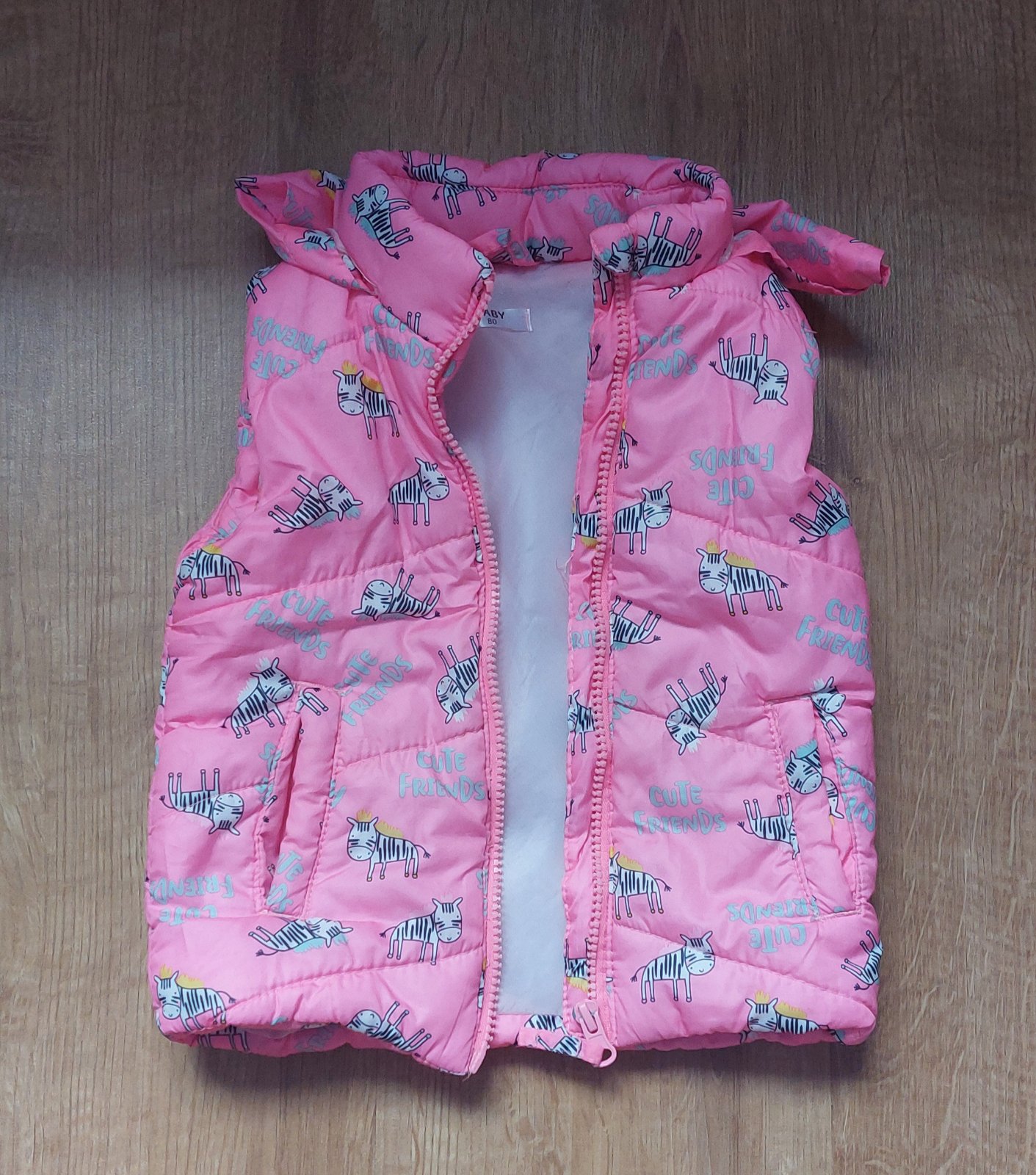 Krásna teplá vesticka s kapucňou, super stav, jediná chybička je uvoľnené prešitie vzadu - nafotené a zohľadnené v cene
