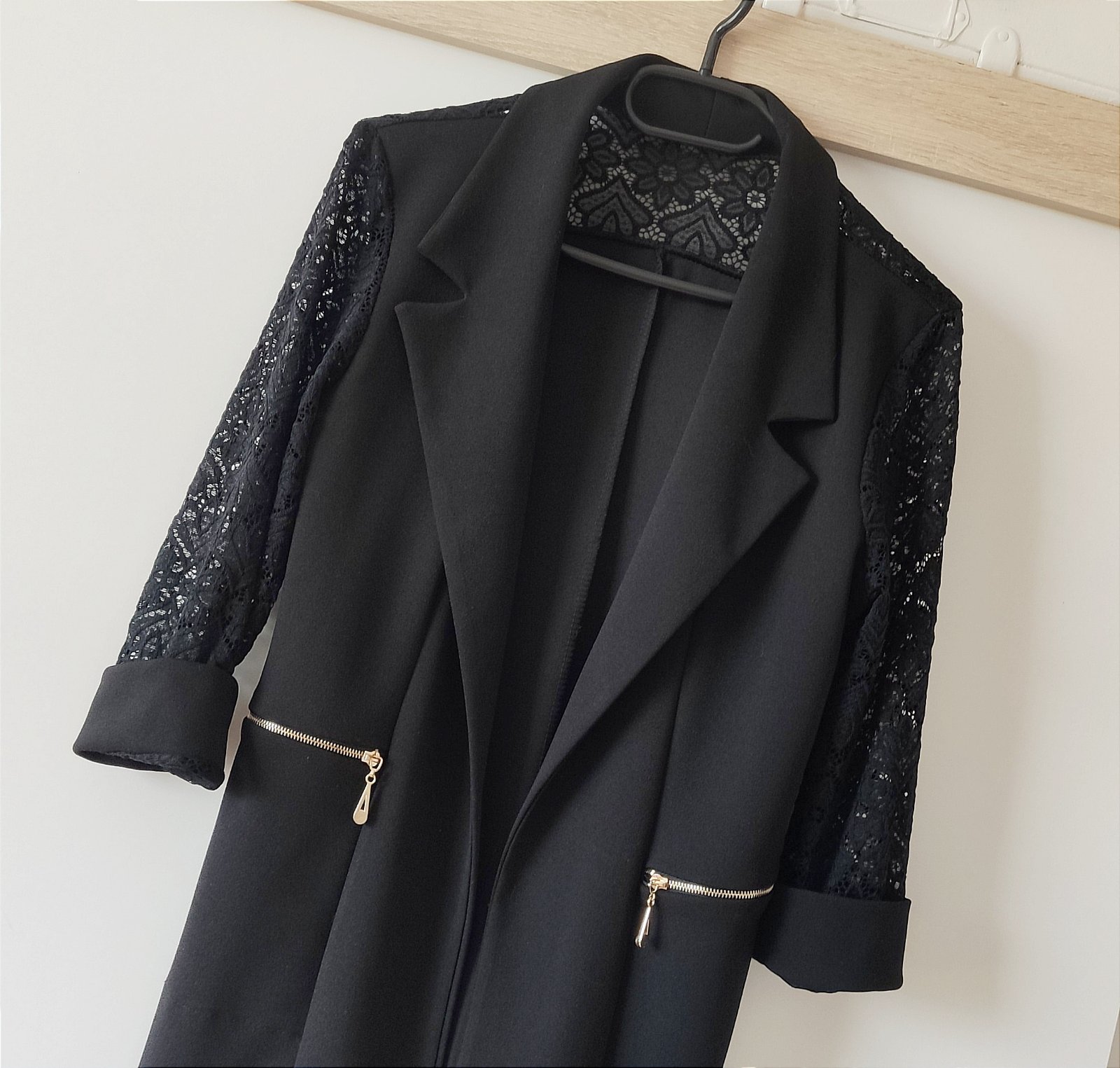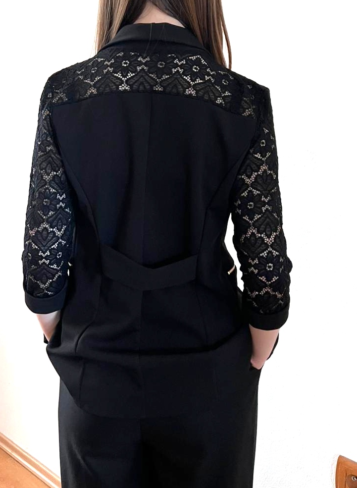 Ponúkam na predaj čierne sako s čipkou na rukávoch a vzadu na ramenách. Veľmi dobrý stav, ak nové, farba krásne čierna, nedalo sa mi lepšie odfotiť. Vpredu sa nezapina. Veľkosť S ale môže byť aj M záleží od postavy. Dĺžka 65cm, rukáv od krku 50cm