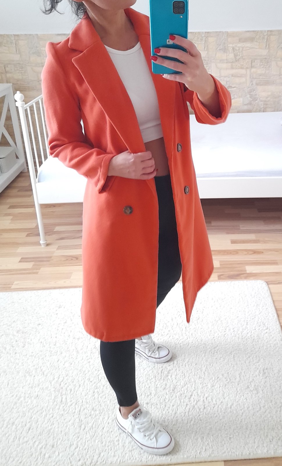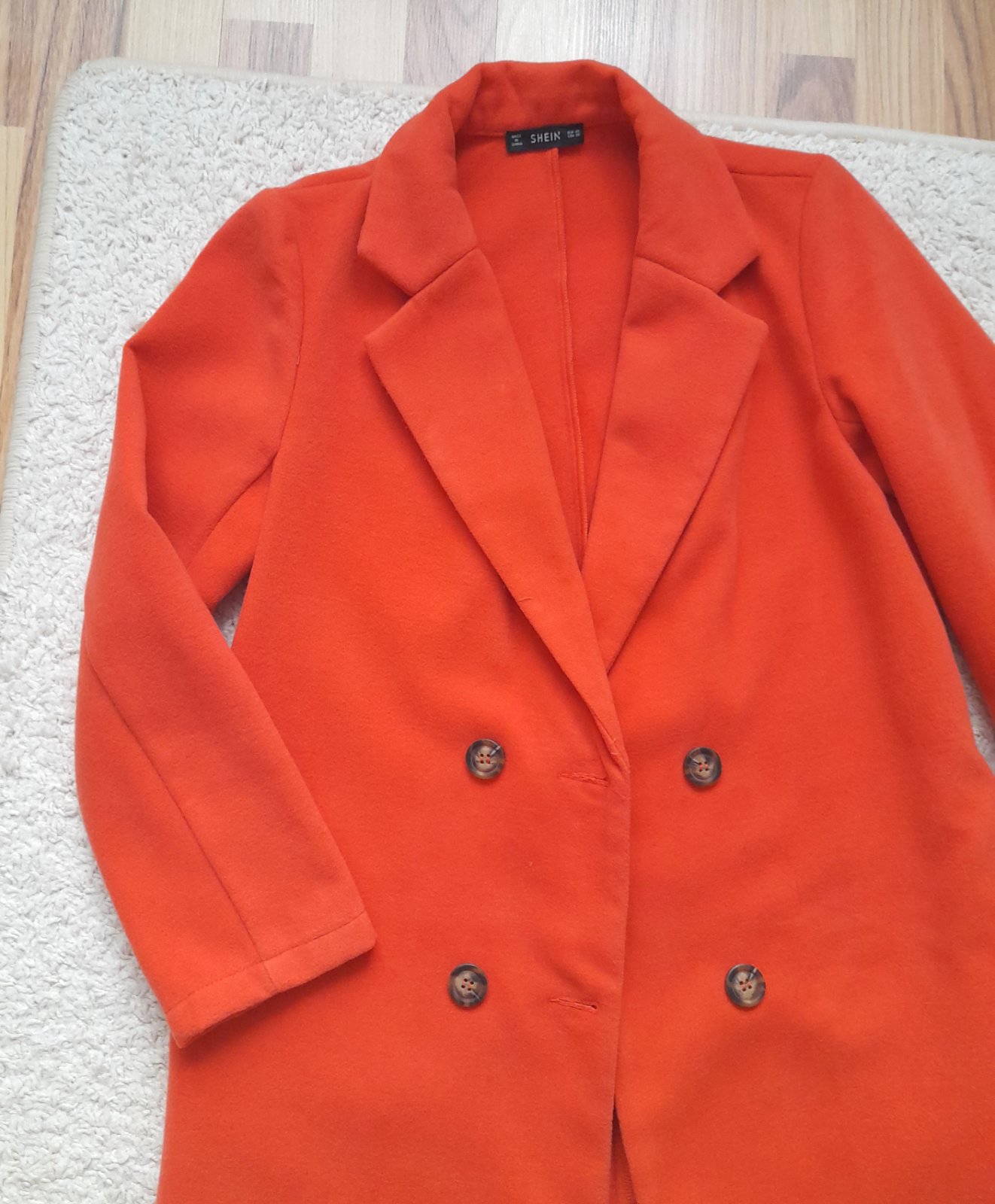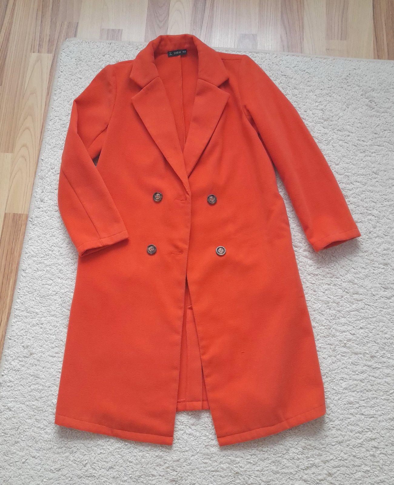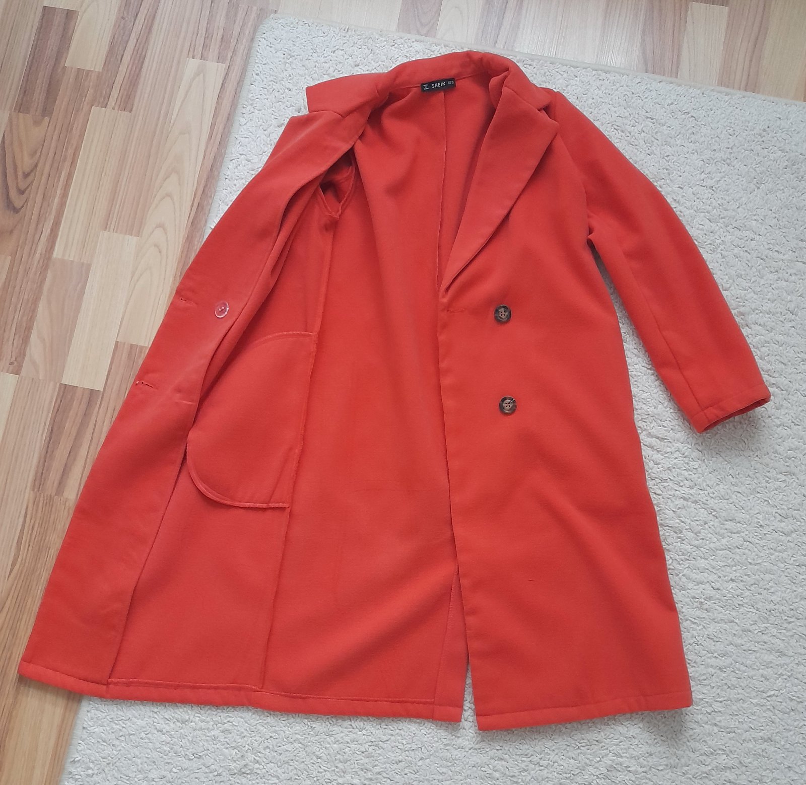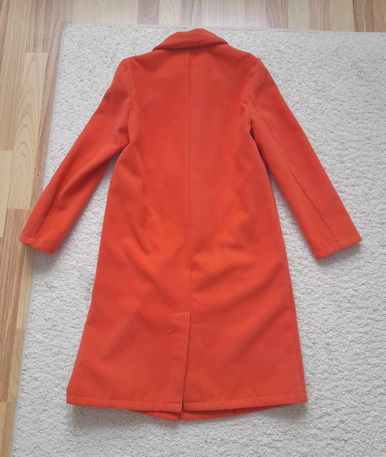 nepodšitý, bočné vrecká, meruňkový, dĺžka 94cm, rukáv 56cm, šírka 48x2cm, píše veľ.XS, skôr S