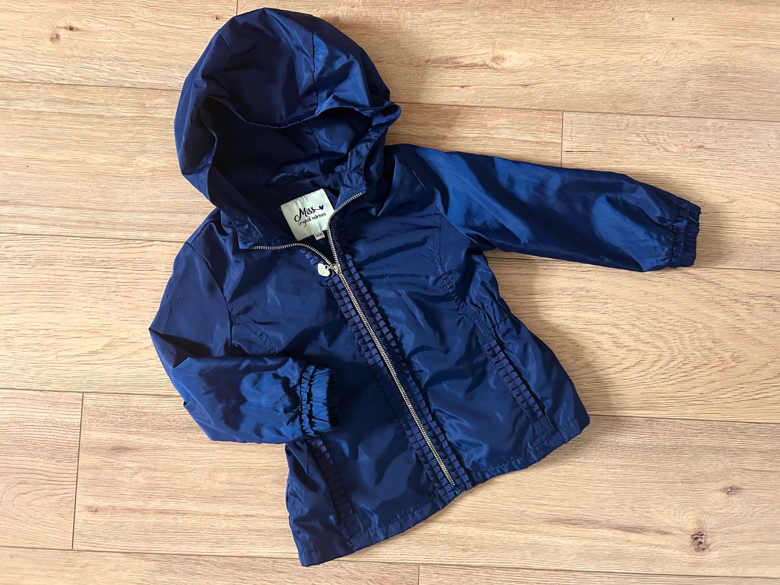 Zimna bunda / kabatik zn.Original Marines, vel.2 (sedi na cca 1,5-3r). Latka je hrubsia, nepremokava, farba pekna tmavomodra len sa mi to nedalo odfotit. Predlzeny strih, v pase opasok, na rukavoch...