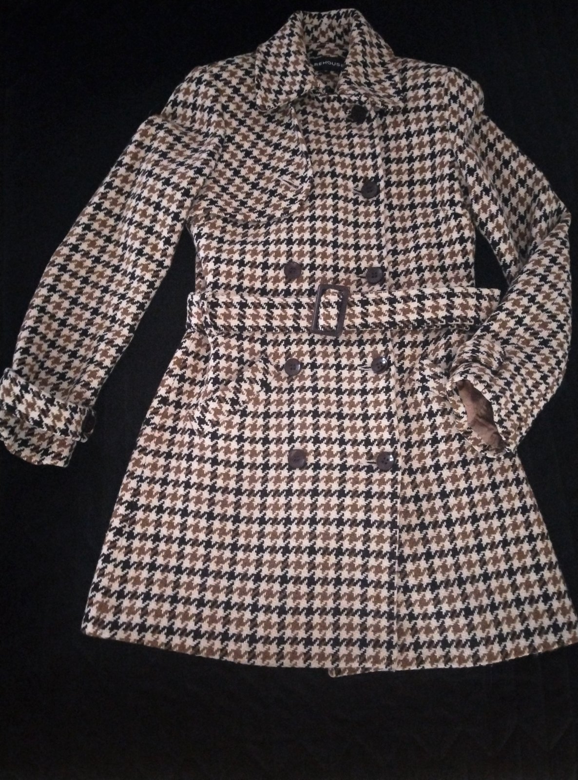Hnedý kabát, imitácia brúsenej kože. Veľkosť písaná S (je UNI - S, M, L).