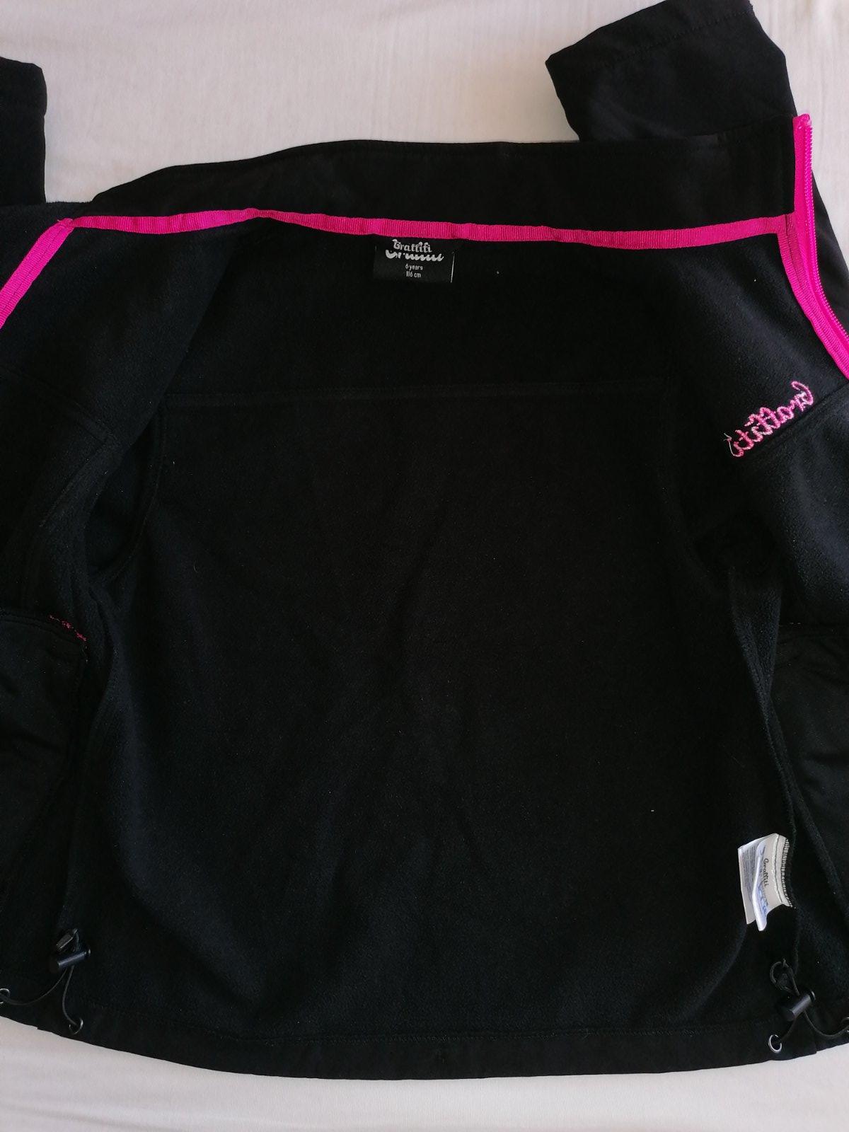 Softshellova bunda, 116 na 6-7 rokov, vetruvzdorna a vodeodolná, vnútri jemný flis, na rukávoch regulácia na suchý zips , spodný diel možno stiahnuť.