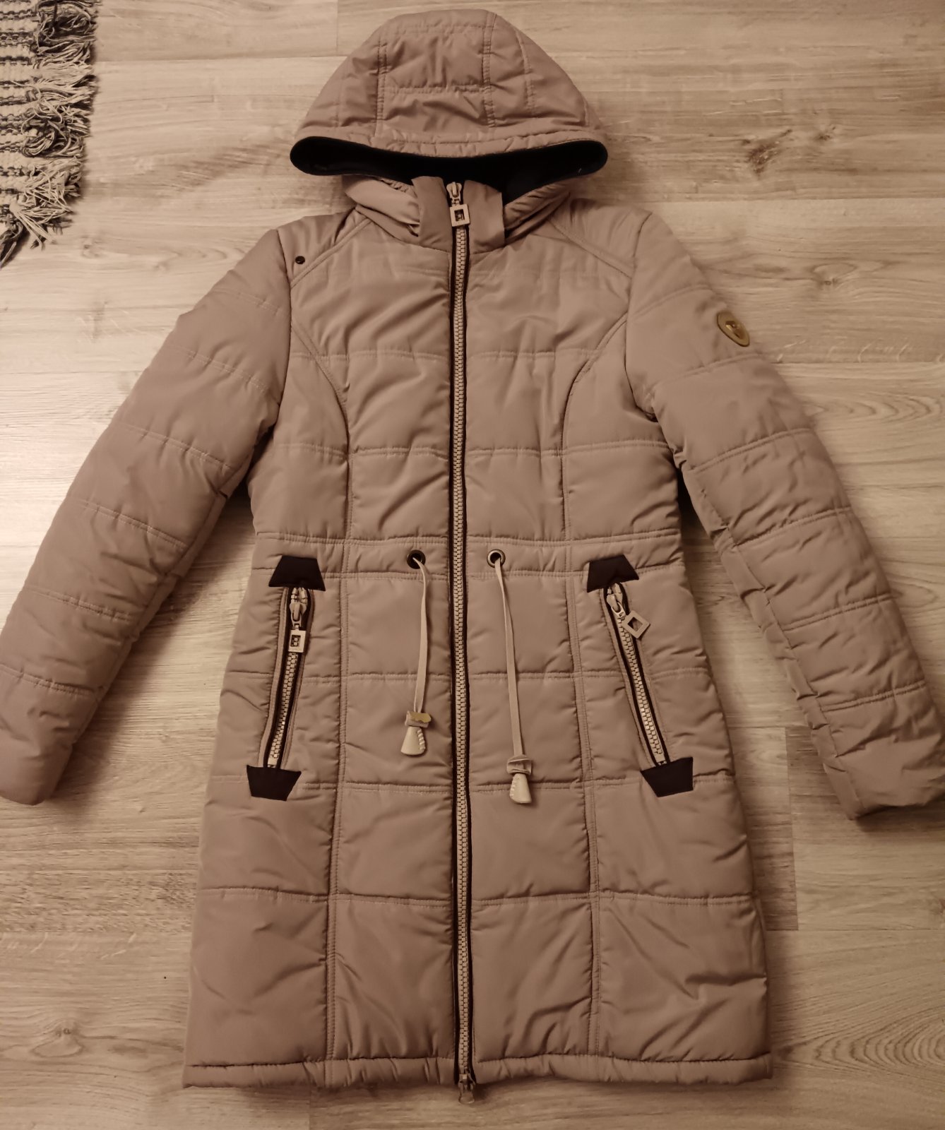 Velmi tepla zimna dlha damska bundicka v pieskovo bezovej farbe znacky DE LUXE SPORTS WEAR vo velkosti 38,sedi na M/L. Bundicku som kupila od jednej pani cez net ako darcek,zial zle odhadnuta velk...