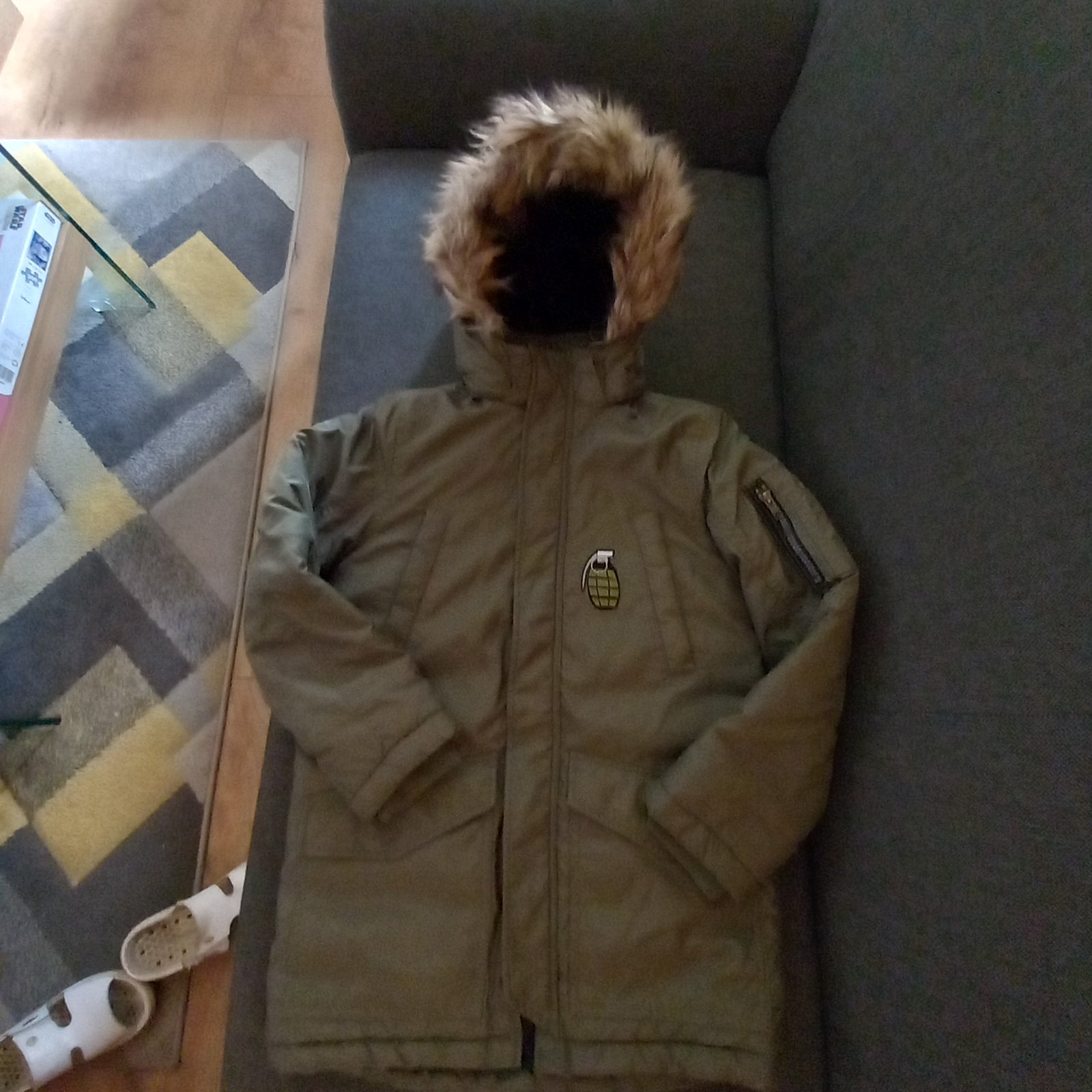 Olivovo zelená. Kvalitná, vo výbornom stave, mini (1cm) rez na chlopni zipsu, v tom vzore nevidno. Vhodná na lyžovačku, či iné. Veľa detailov. Pás proti snehu. P
