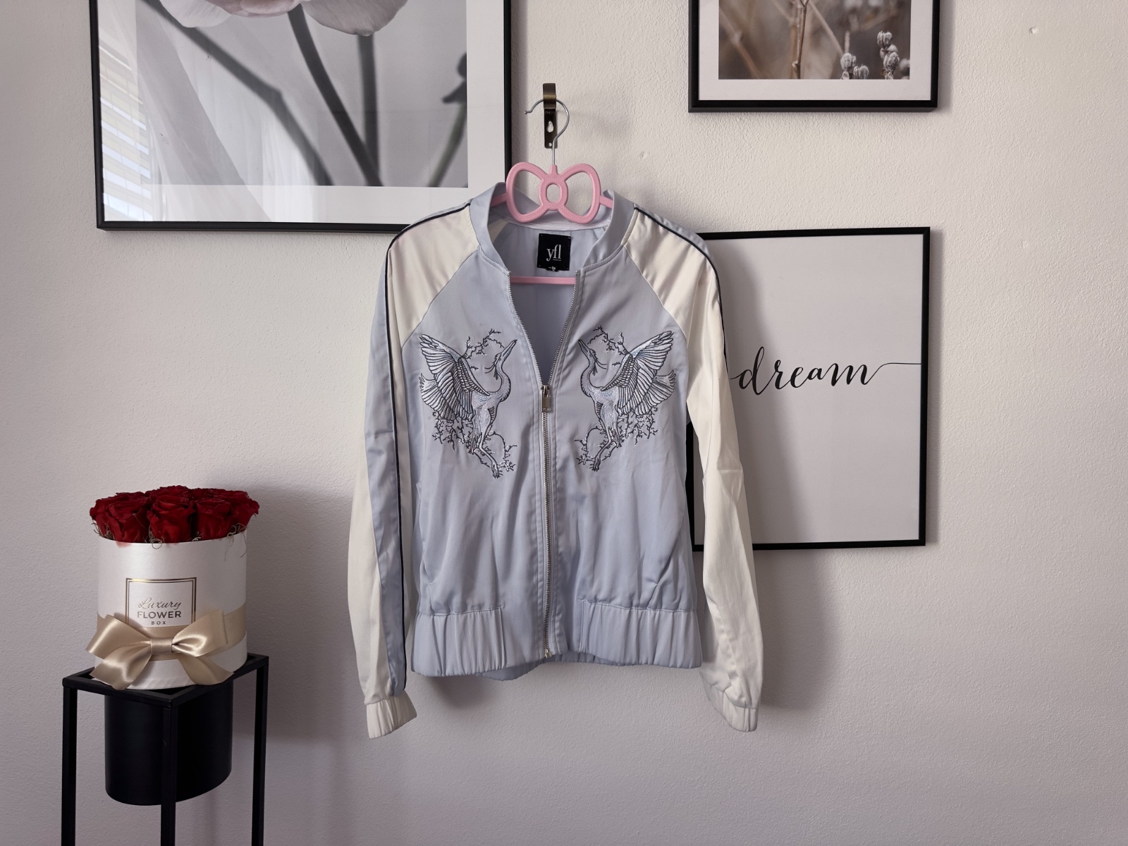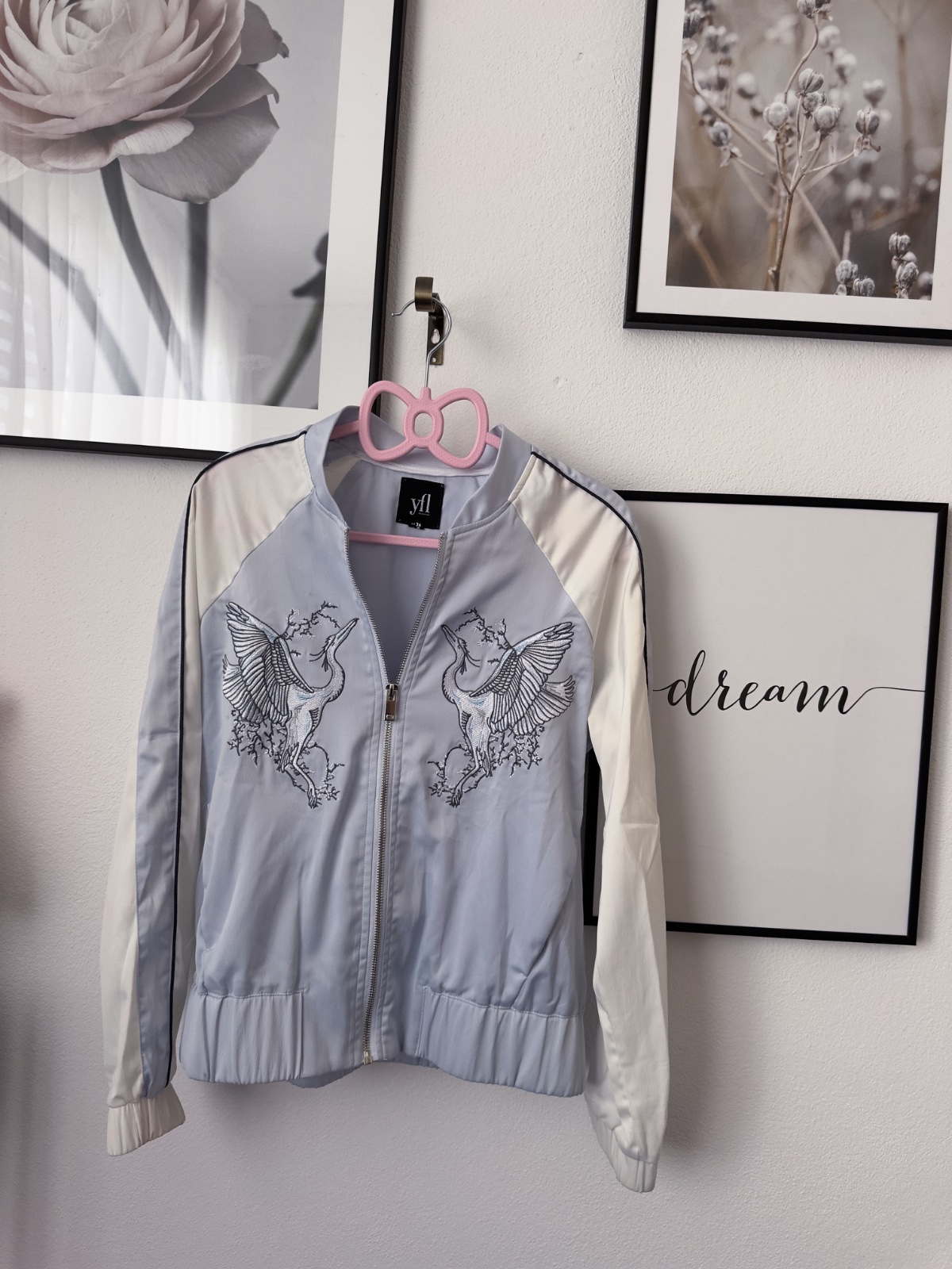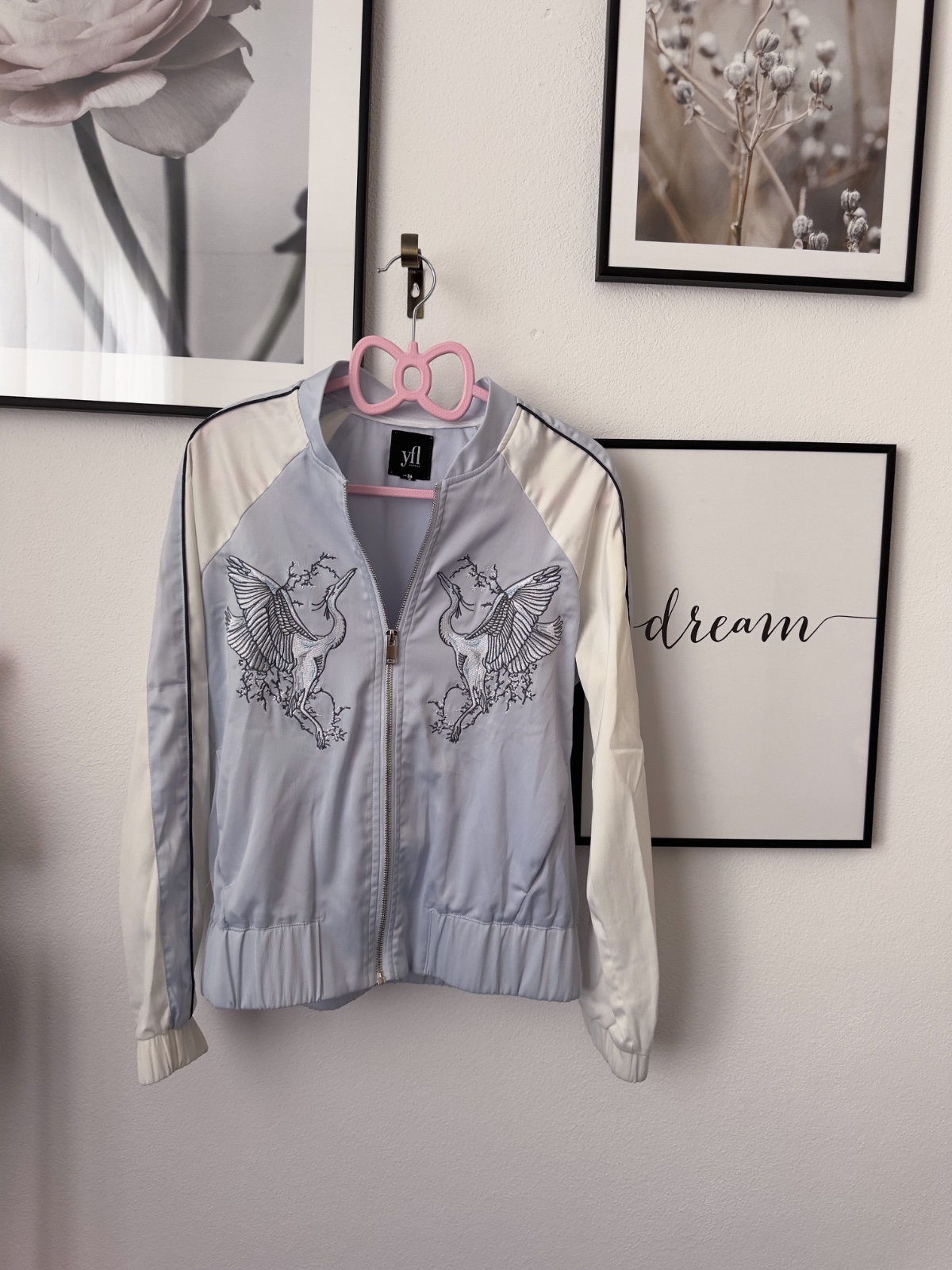 Posuniem blankytne modrú bomberku s výšivkou v prednej časti. Krásne sedí, strieborný zips, do pása.