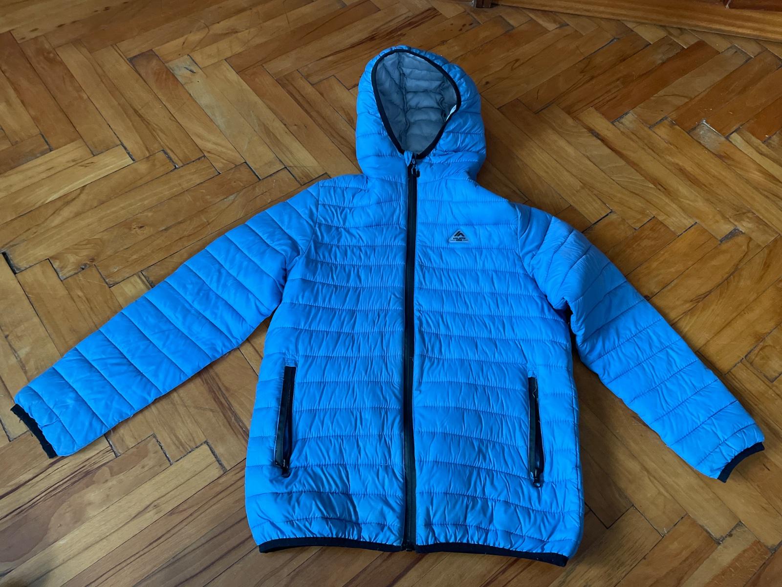 zachovala bez poškodení bledomodrá podšitá sieťkovinou bunda kapucňa napevno,na rukávoch našité lampasy, rozmery nafotené cena je bez post.