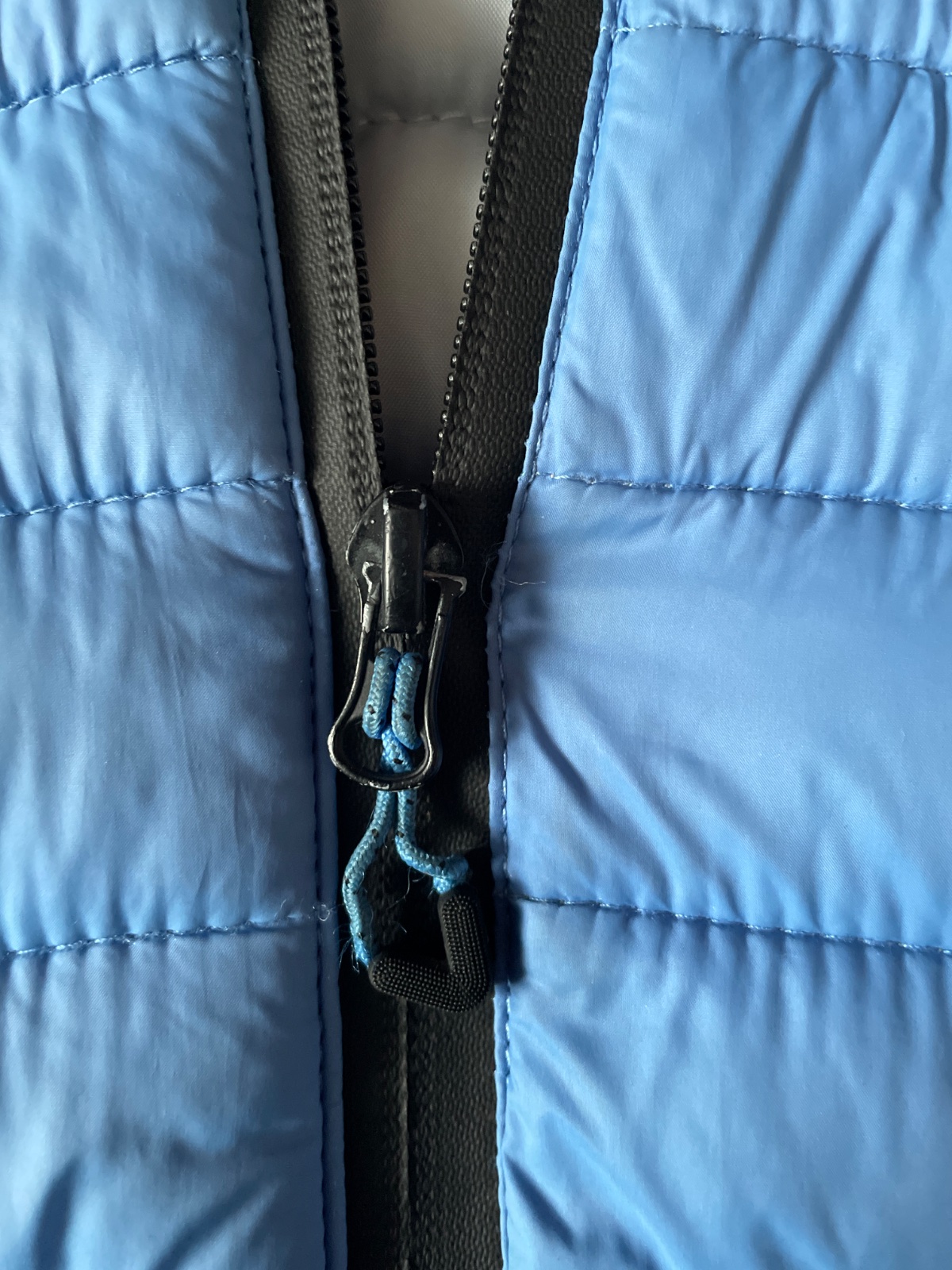 Pekna tenka sustakova bundicka vo velmi dobrom stave. Je podsita sietovinou. Je taka modra- takmer tyrkysova. Bundicka bola zvnutra pogumovana a to pogumovanie sa zlupalo a teraz to presvita cez la...