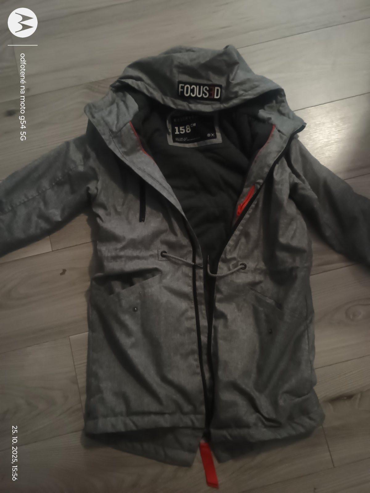 Predĺžená jesenná bunda s kapucňou značky Reserved, veľkosť 158. 2 vonkajšie vrecká, 1 vnútorné, 1vrecko na rukáve. V páse sa dá stiahnuť gumičkou. Kapucňa sa nedá odopnúť. Celková dĺžka 80cm. Šírk...