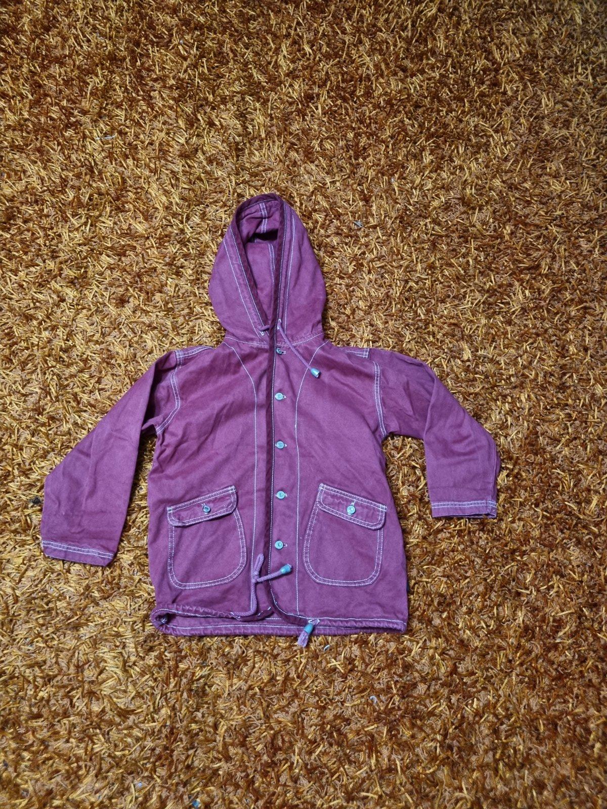 Dievčenská rifľová bundička s kapucňou. Zapínanie je vpredu na gombíky. Dĺžka je 54cm,obvod hrudníka je 46x2cm a obvod pása je 47x2cm. Dĺžka rukáva od krku je 54cm.