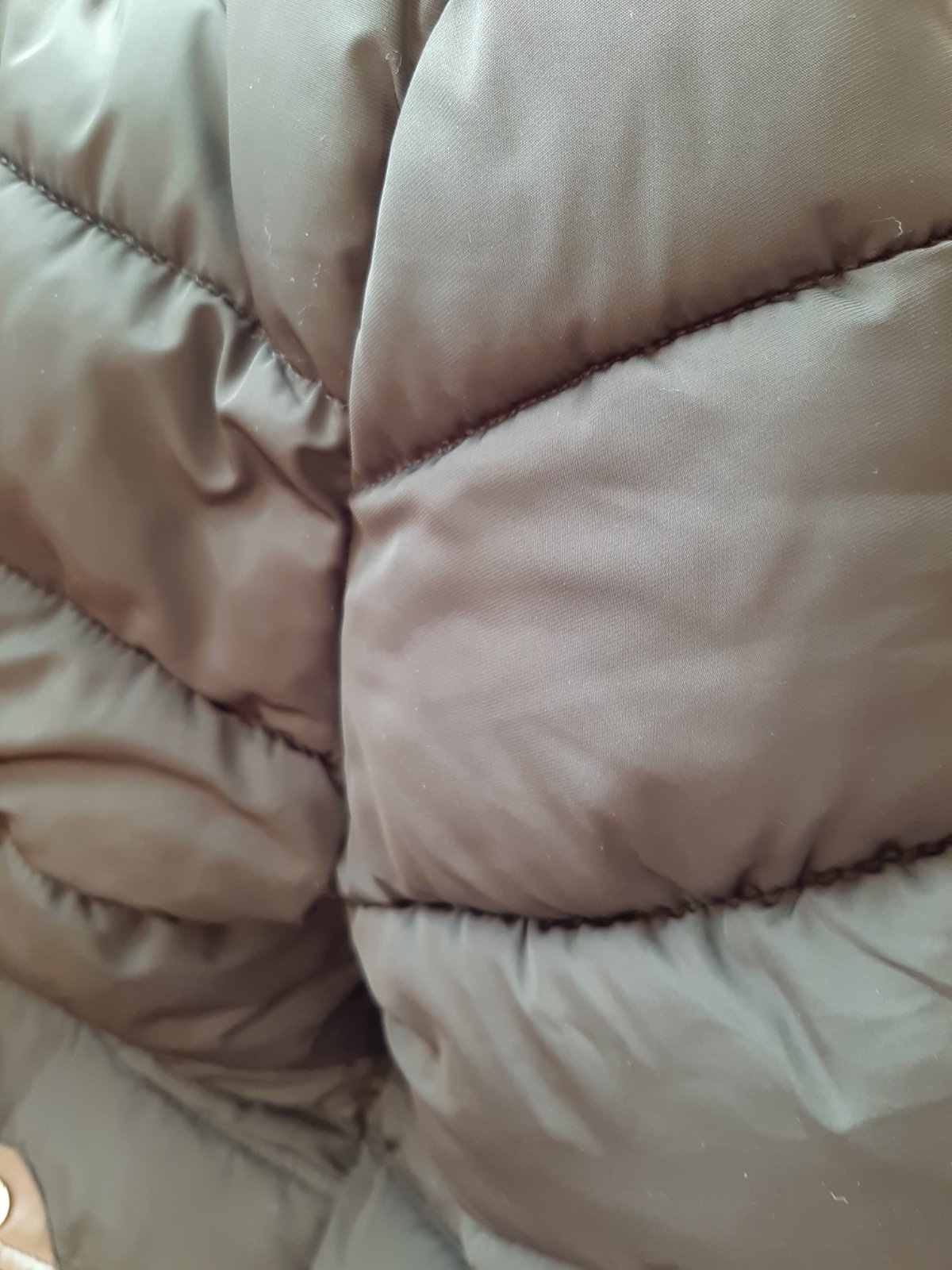 Bez poškodení. Do miernejšej zimy. Kapucňa na zips. Ruk. od krku 78, š. pod pazuchou nenatiahnutá 52, š. natiahnutá 57, š. v páse 47- 55, š. dolu 64, d. 91 cm