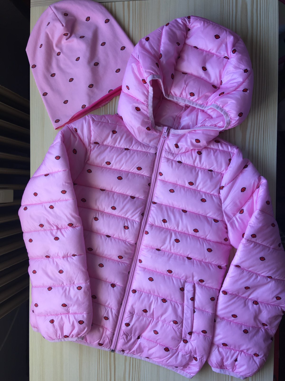 Extra ľahká dievčenská prechodná vetrovka značky Benetton vo výbornom nosenom stave s pasujúcou bavlnenou čiapkou s motívom pusiniek vo veľkosti 140.
