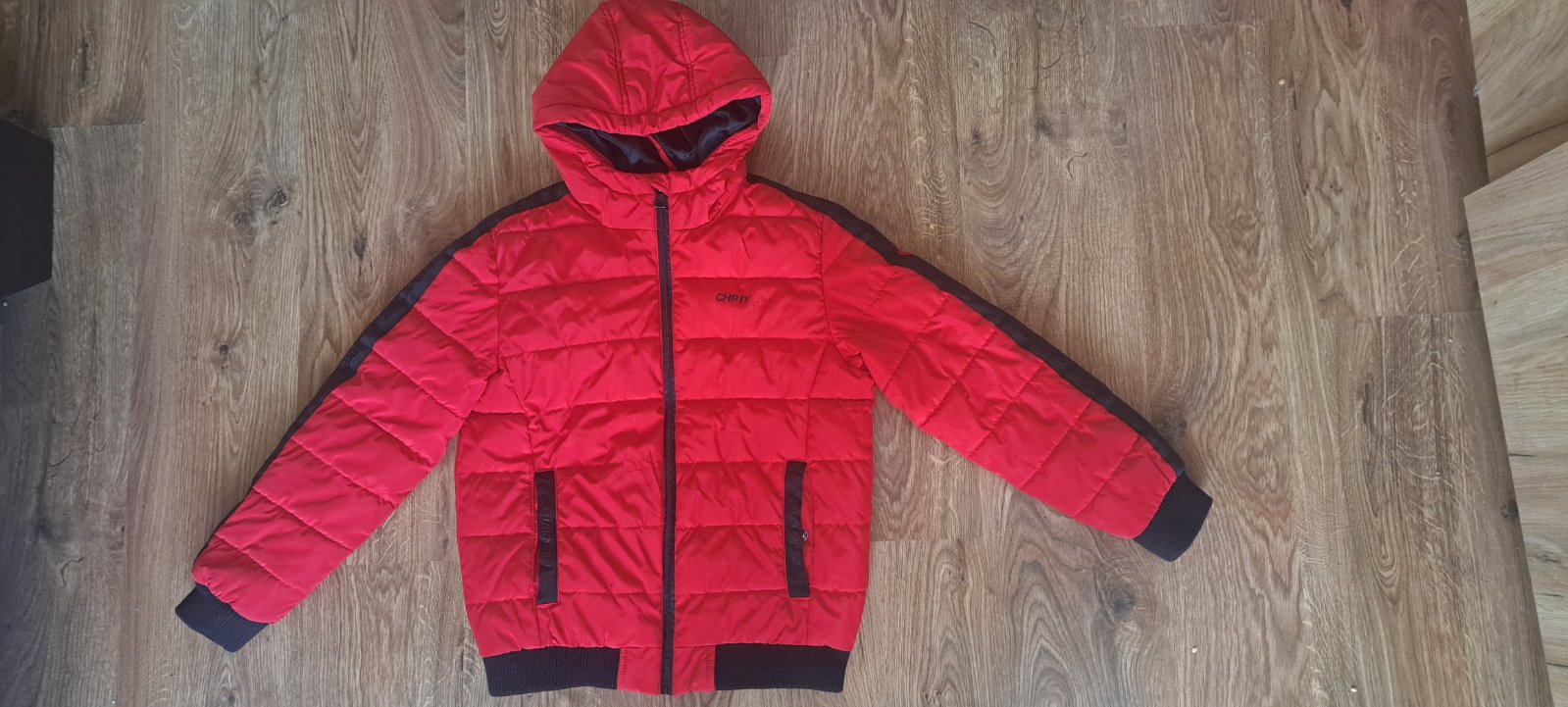 Predám chlapčenskú zimnú bundu s kapucňou. Nosená, ale v dobrom stave. Chyby sú odfotené: nápis z polovice zošúchaný, zašpinené niečím čiernym (nedá sa vyprať). Značka: Chapter Young. Veľkosť: 146/152