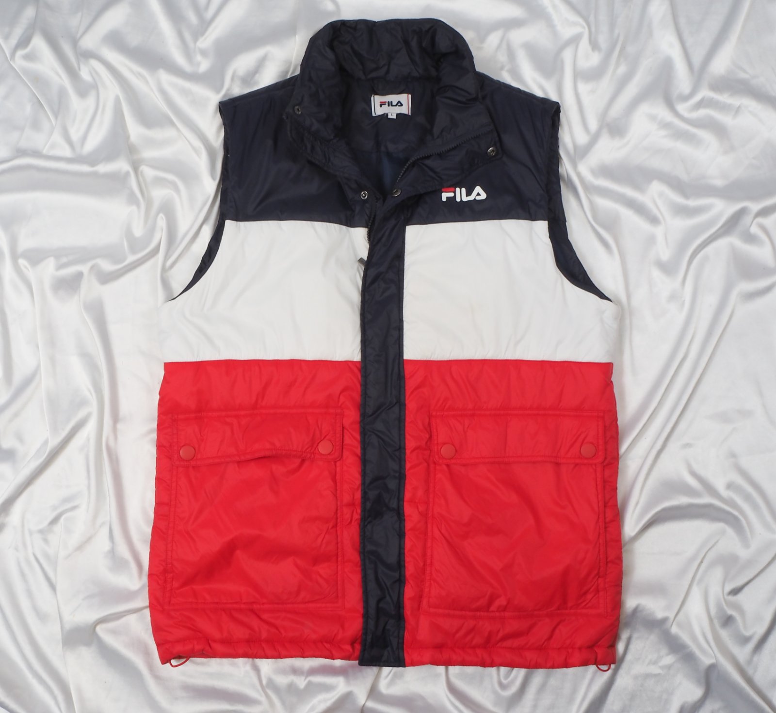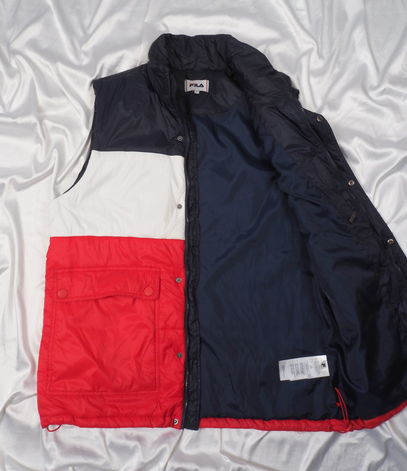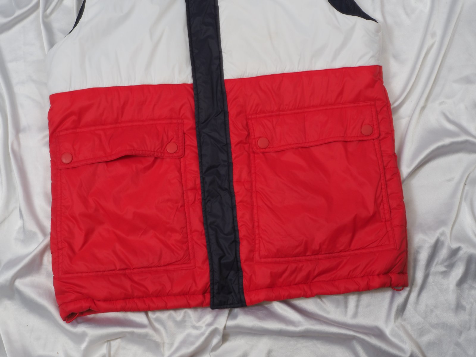 Kvalitná oteplená pánska vesta, tmavomodro-červeno-biela, zapínanie na zips, vpredu vrecká, materiál 100% nylon, ľahúčka, ako nová.