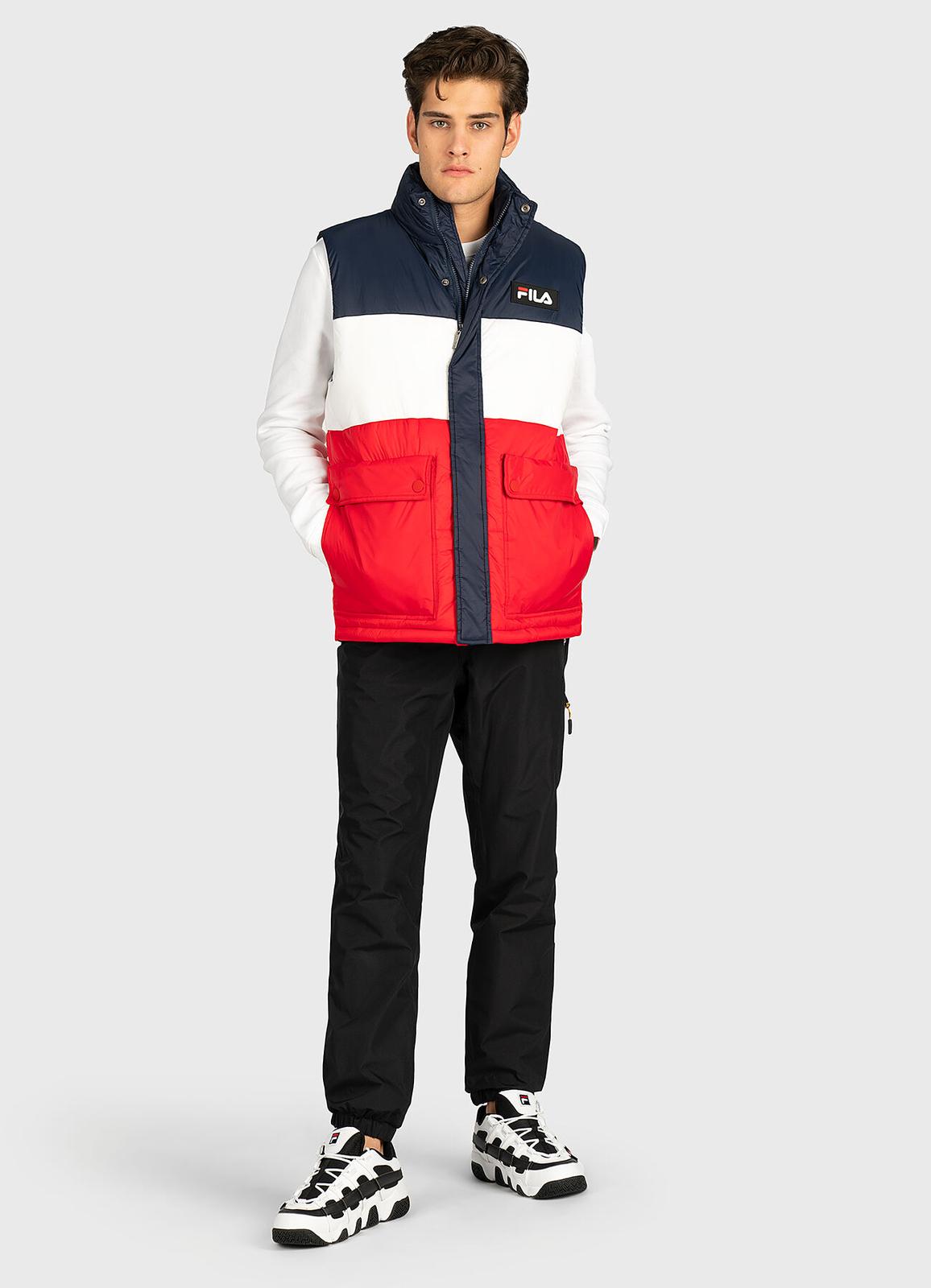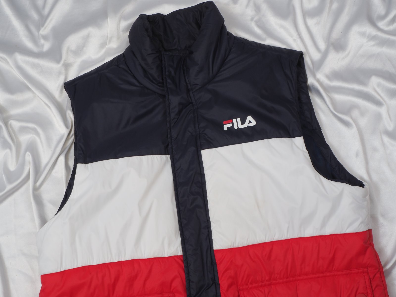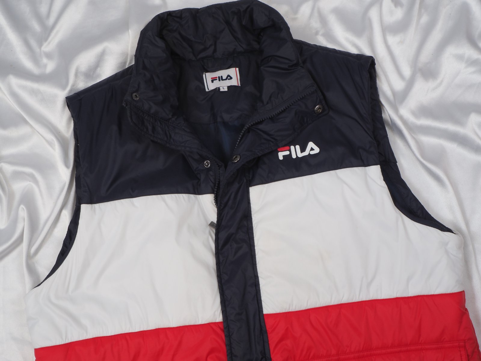 Kvalitná oteplená pánska vesta, tmavomodro-červeno-biela, zapínanie na zips, vpredu vrecká, materiál 100% nylon, ľahúčka, ako nová.
