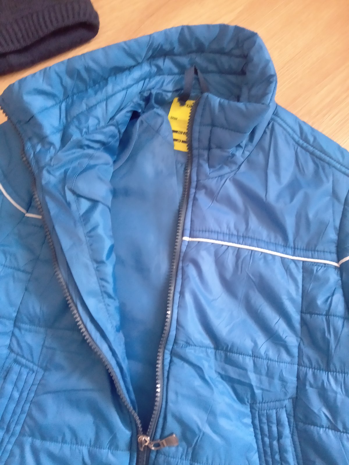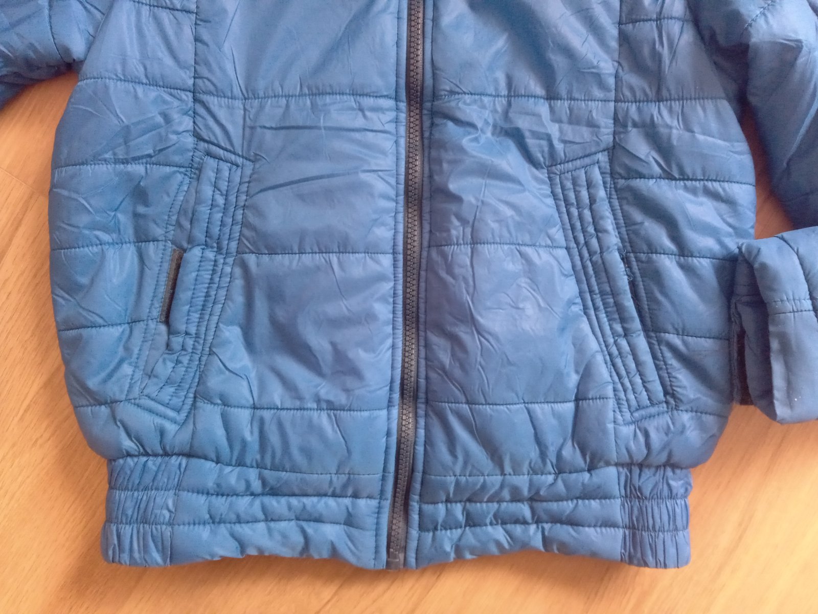 Nosená, stále v dobrom stave, pekná modrá, bez chybičiek, dve bočné vrecká, naspodu zúžená širokou gumičkou, na koncoch rukávov suchý zips, nie je hrubá, je mierne zateplená, veľ. JM, chlapčenské M, premerajte