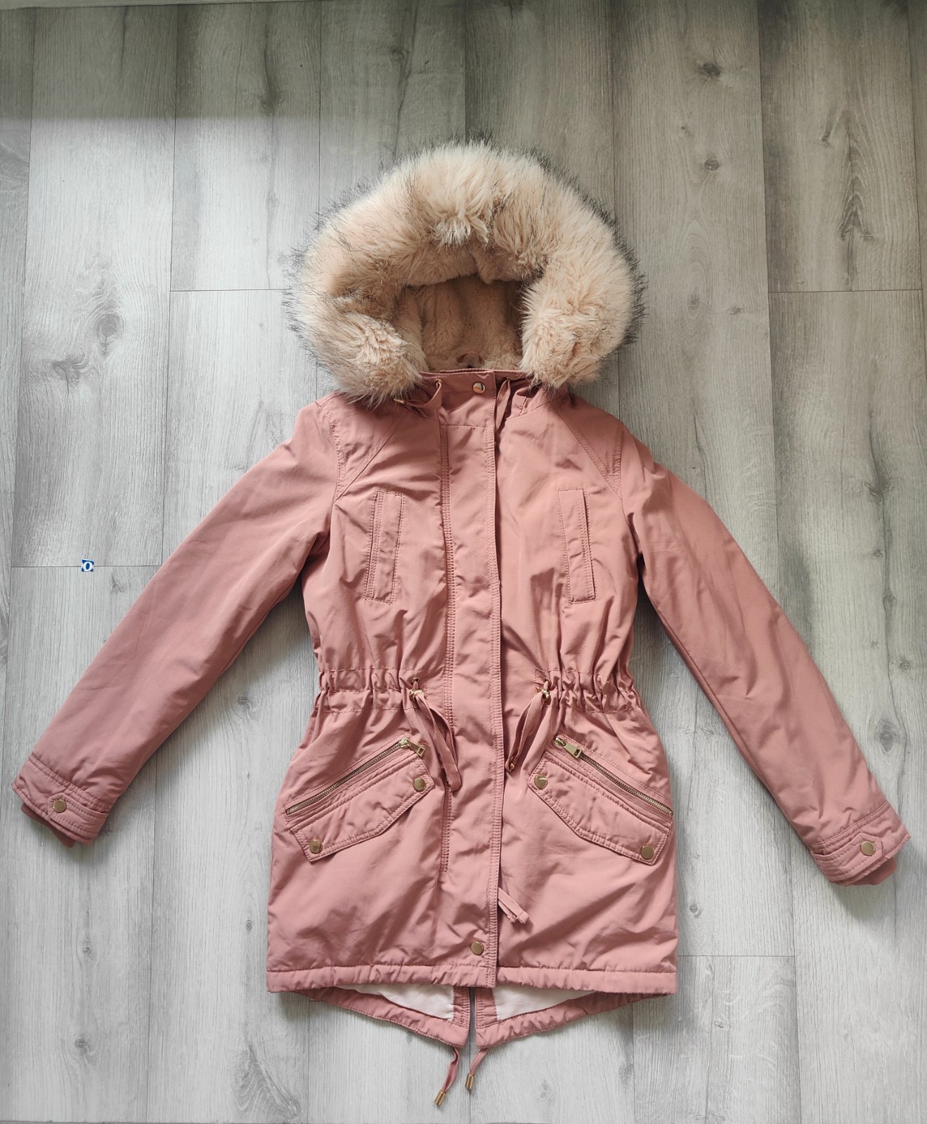 Krásna staroružová parka (teplá bunda do miernejsej zimy aj na jeseň a na jar) so zlatými detailami a veľkou nadýchanou kožušinkou. Bola oblečená iba 3x, je mi úzka. Vhodná na veľkosť XS a menšie S a na výšku postavy do 172cm.