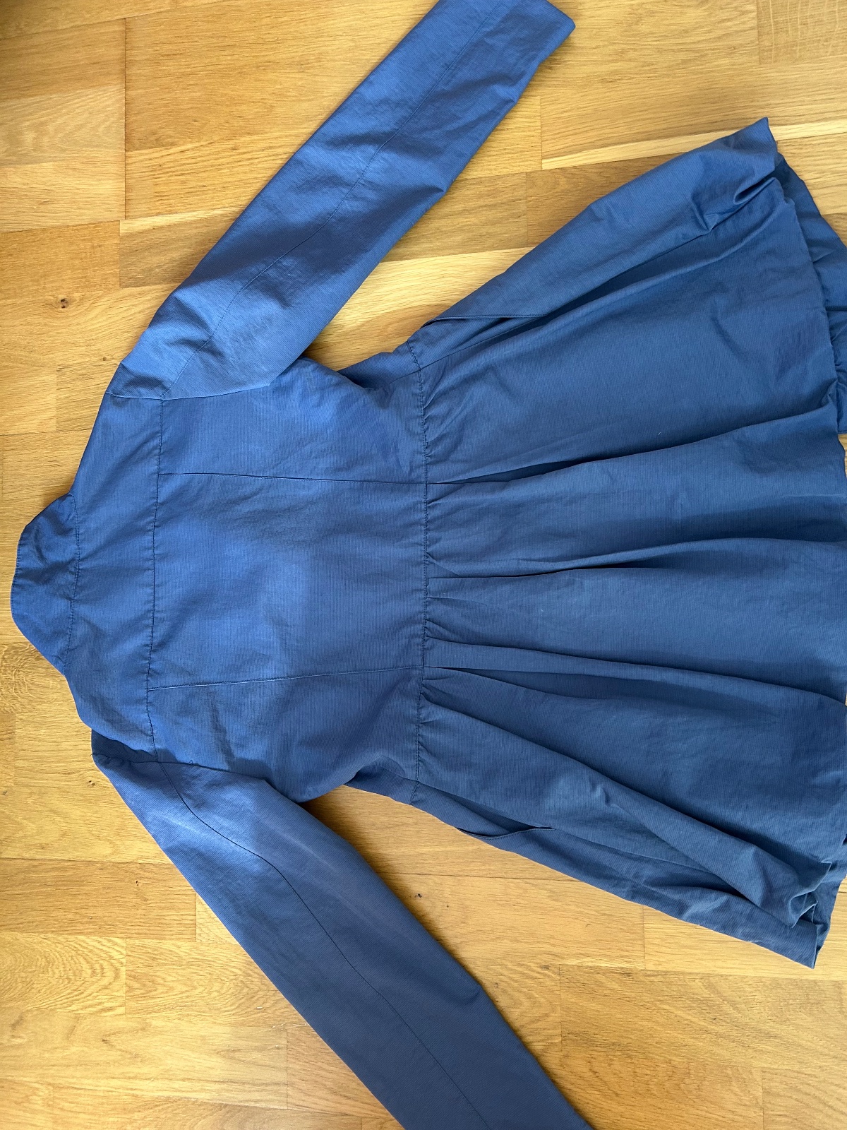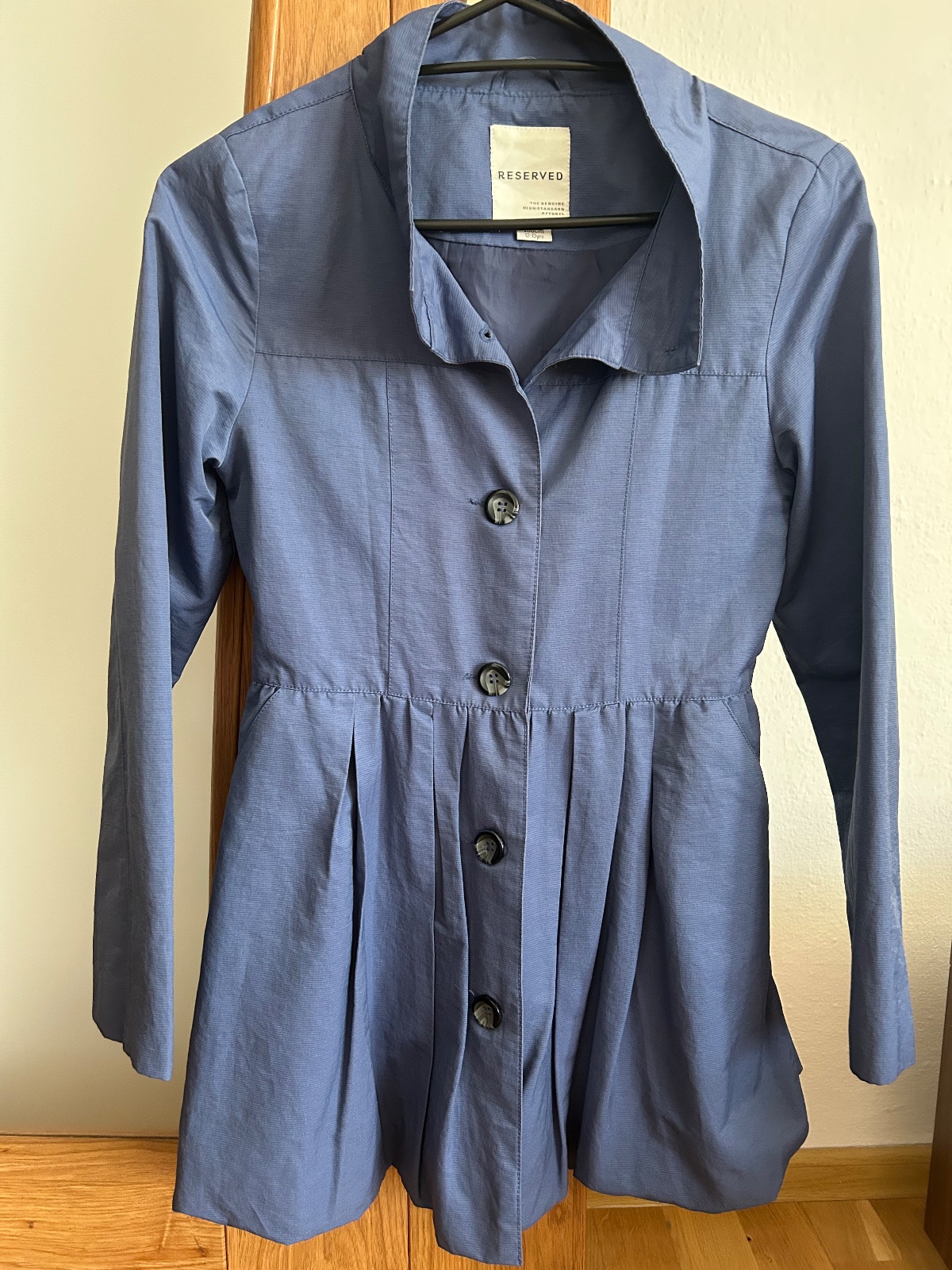 Krásna bundička v top stave, oblečená pár krát. Farba je taká sivo-modrá, len mi to tak všelijako nafotilo. Celk. dĺžka 77 cm, šírka 38cm, rukáv 55 cm.
