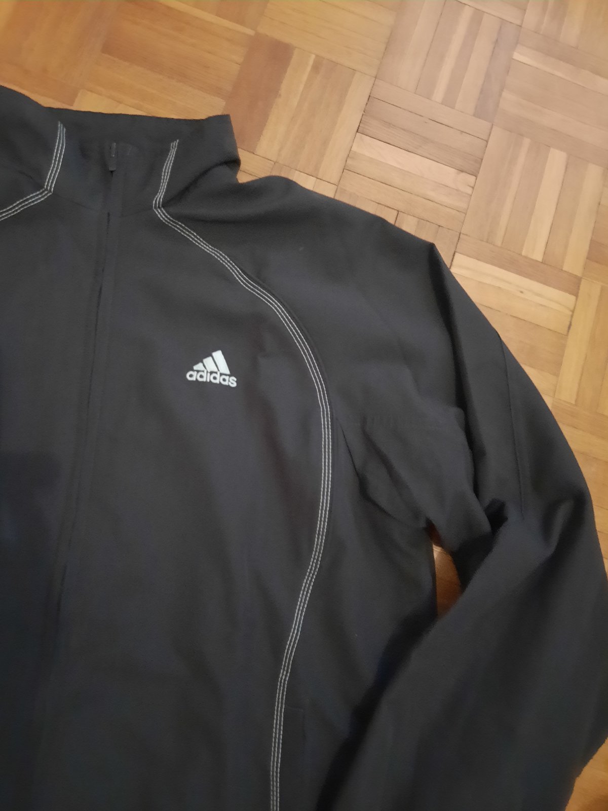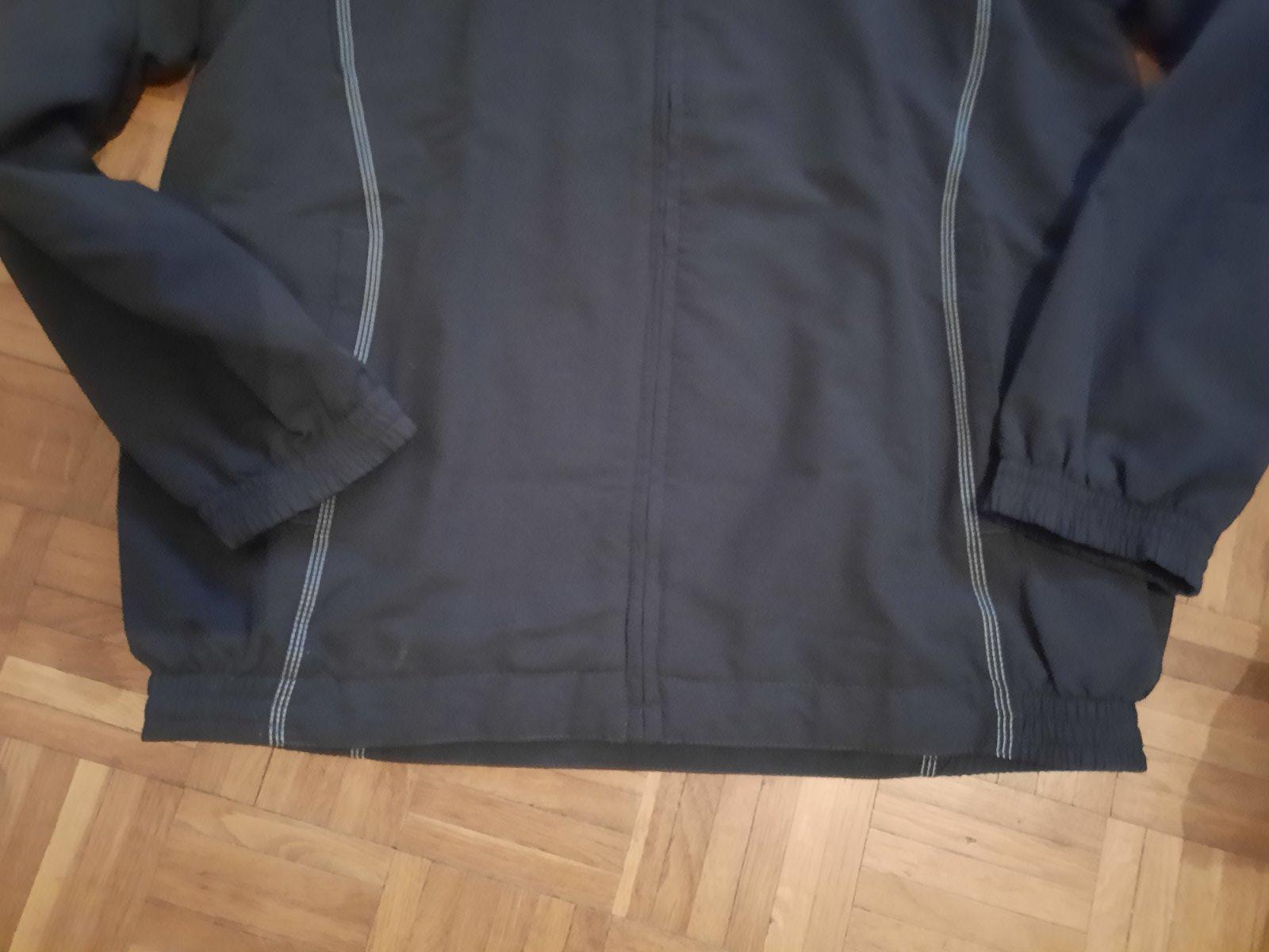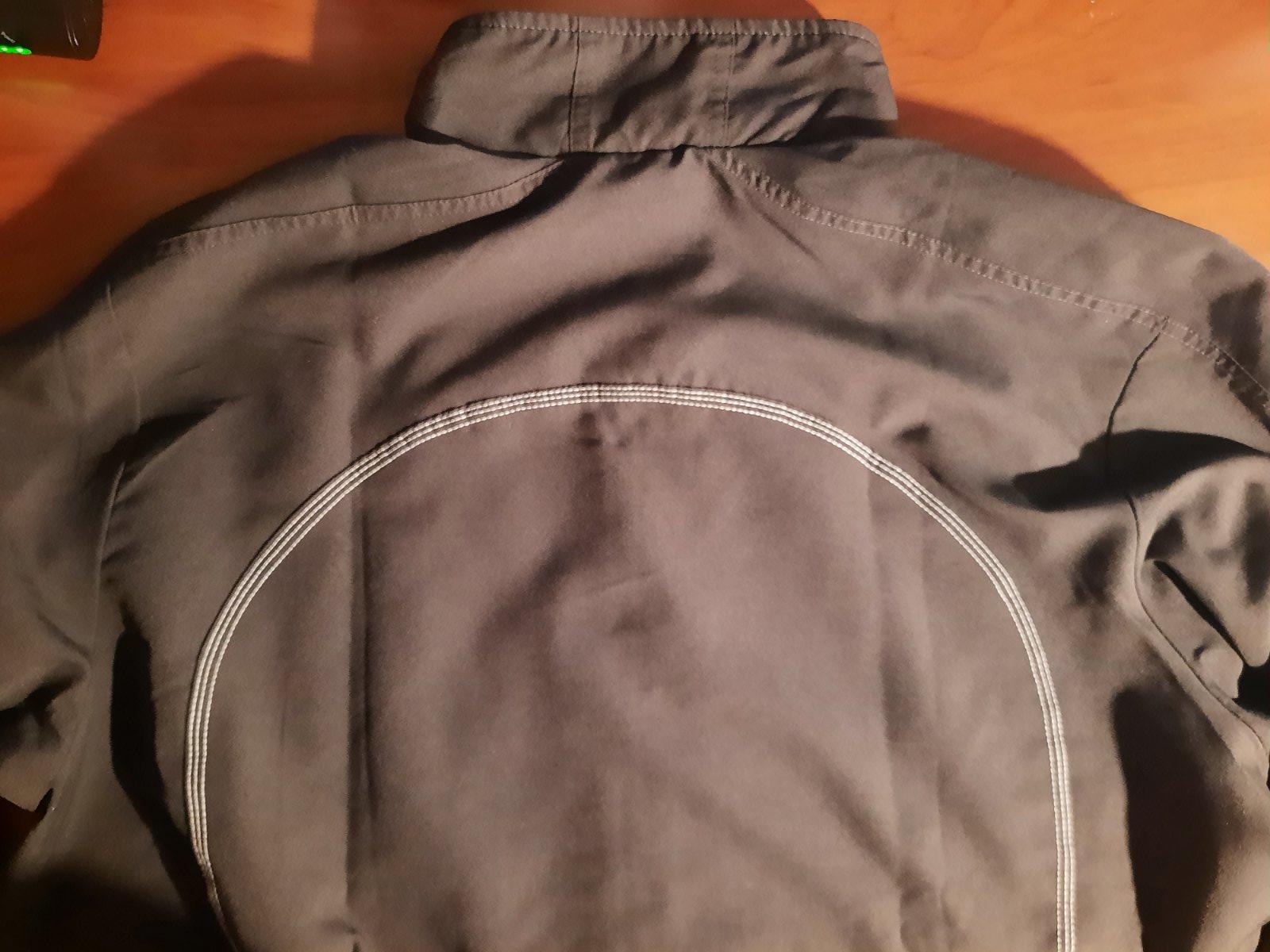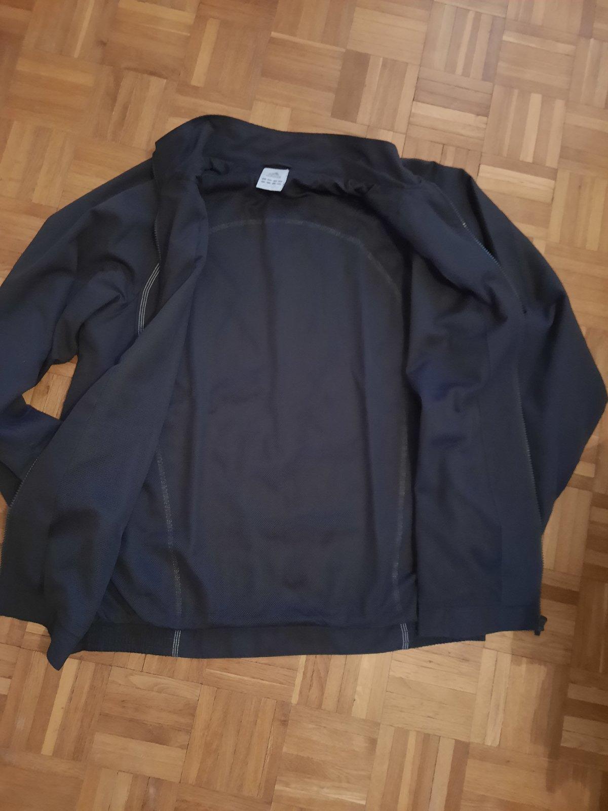 Veľmi pekná podšitá (sieťovanou látkou) prechodná bunda na zips. Z boku sú vačky (na jednom malilinké poškodenie). Na pravej strane z boku pri šití je kúsok natrhnuté. Bunda je detailne vypracovaná. Na spodku z bokov je guma. Rukávy končia tiež na gumu. Zvnútra rukáv je po lakeť podšitá podšívkou. Vonkajšia látka nie je tá šmykľavá, ale príjemná na dotyk.