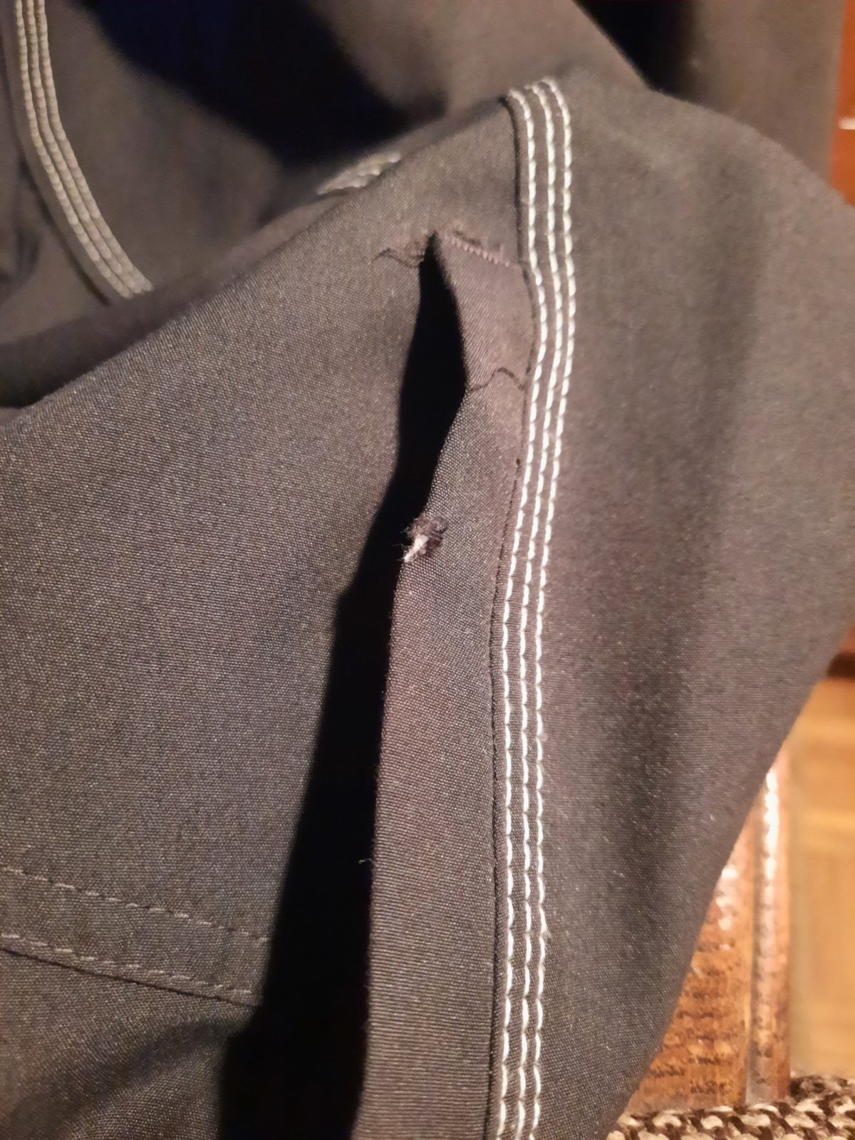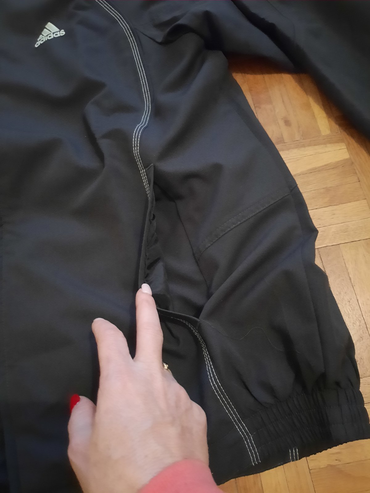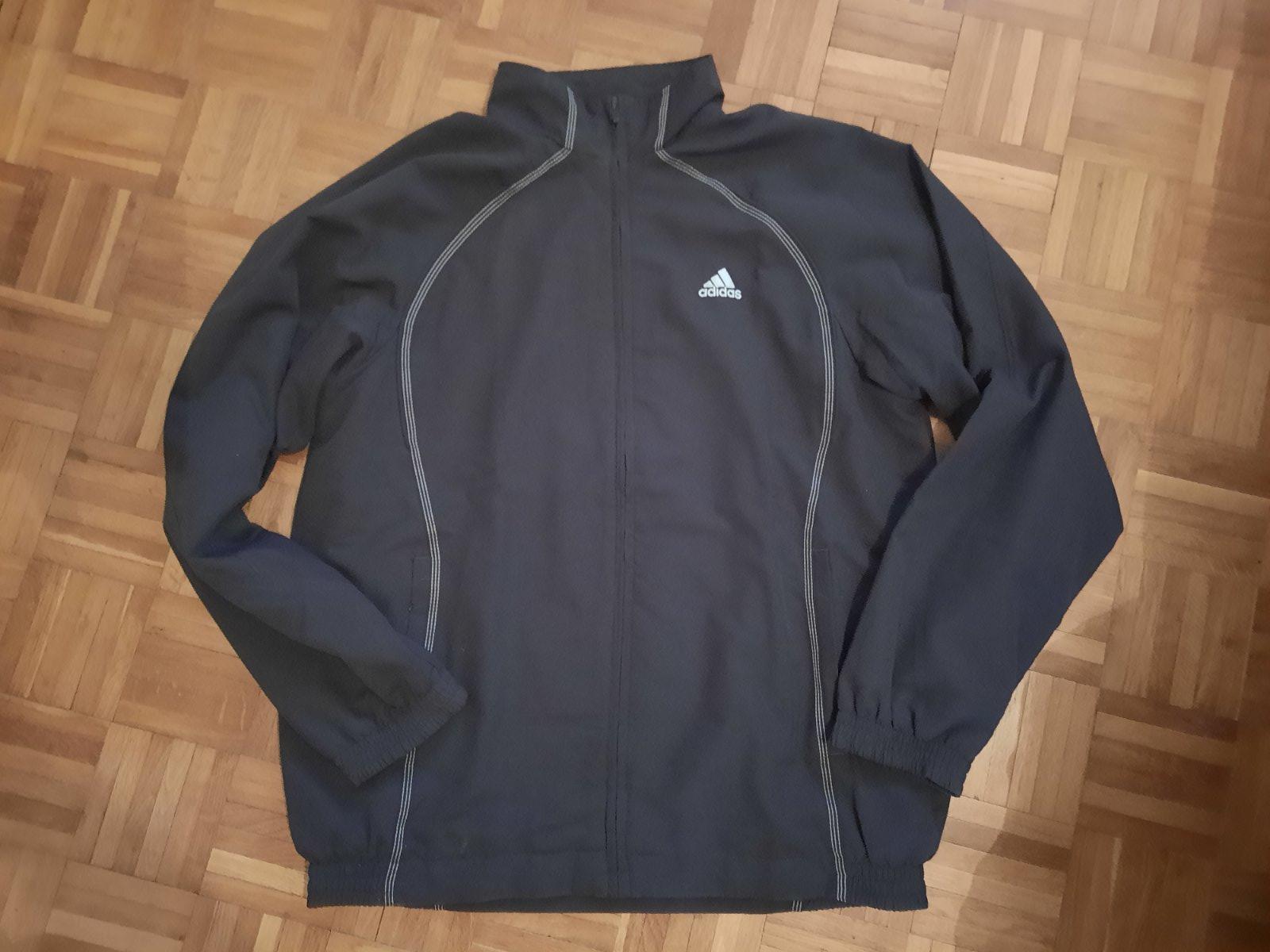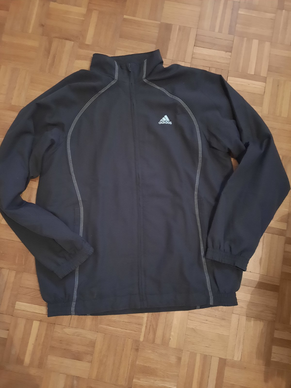 Veľmi pekná podšitá (sieťovanou látkou) prechodná bunda na zips. Z boku sú vačky (na jednom malilinké poškodenie). Na pravej strane z boku pri šití je kúsok natrhnuté. Bunda je detailne vypracovaná. Na spodku z bokov je guma. Rukávy končia tiež na gumu. Zvnútra rukáv je po lakeť podšitá podšívkou. Vonkajšia látka nie je tá šmykľavá, ale príjemná na dotyk.
