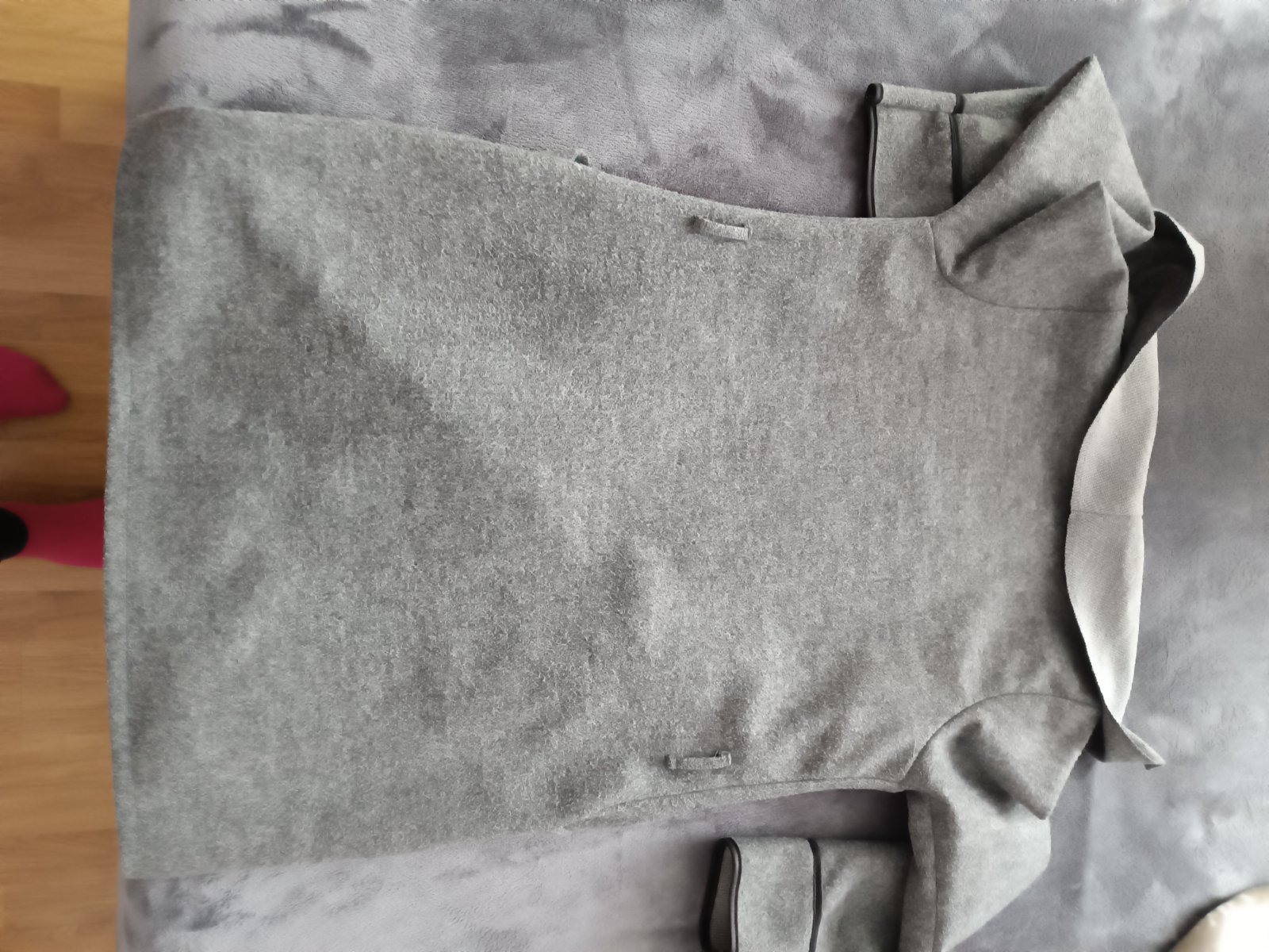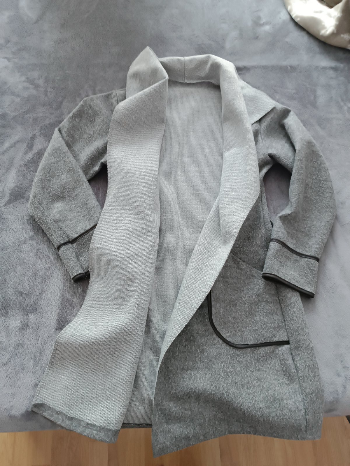 Posuniem tenší kabátikový kardigán na jar/jeseň, sivá farba, v. Uni (max. do L). Cez prsia cca 104cm. Má pútka na opasok, opasok ale nie je súčasťou.