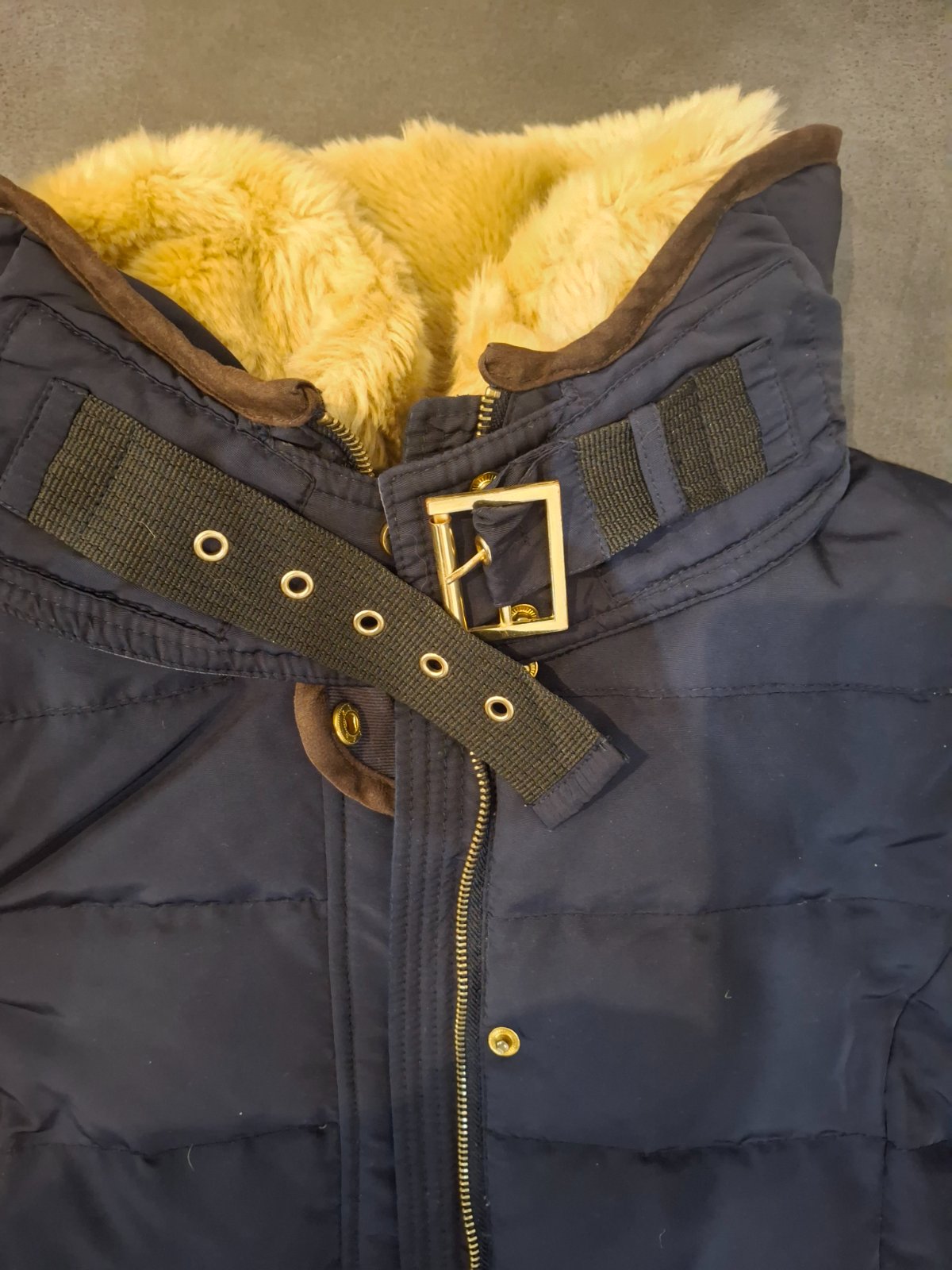 Výborný stav, nosená málo, nepremokavá, teplá, kapucka sa dá odopnúť aj kožušina...farba tmavomodrá, zips je zlatý Rozmery: Veľkosť uvedená M , no sedí skôr na S Dĺžka 57cm, šírka pod pazuškou...
