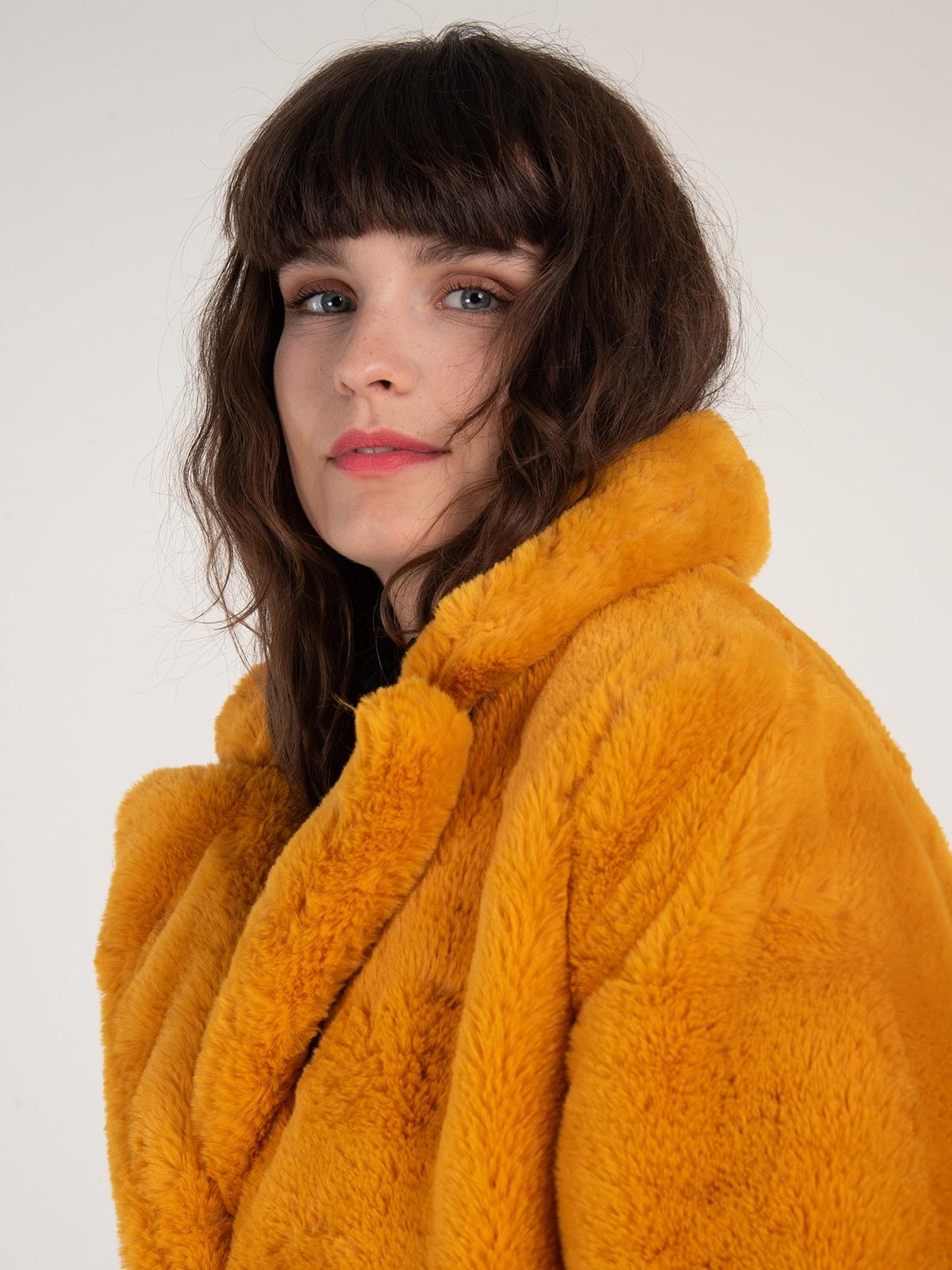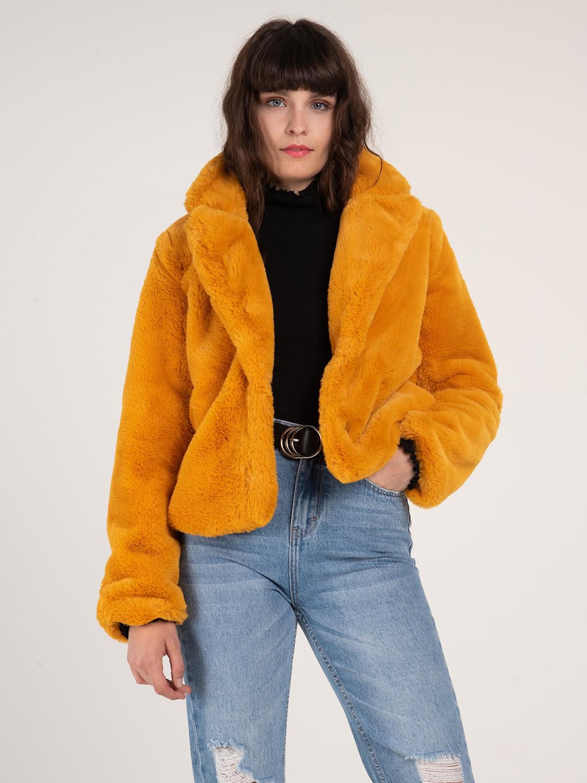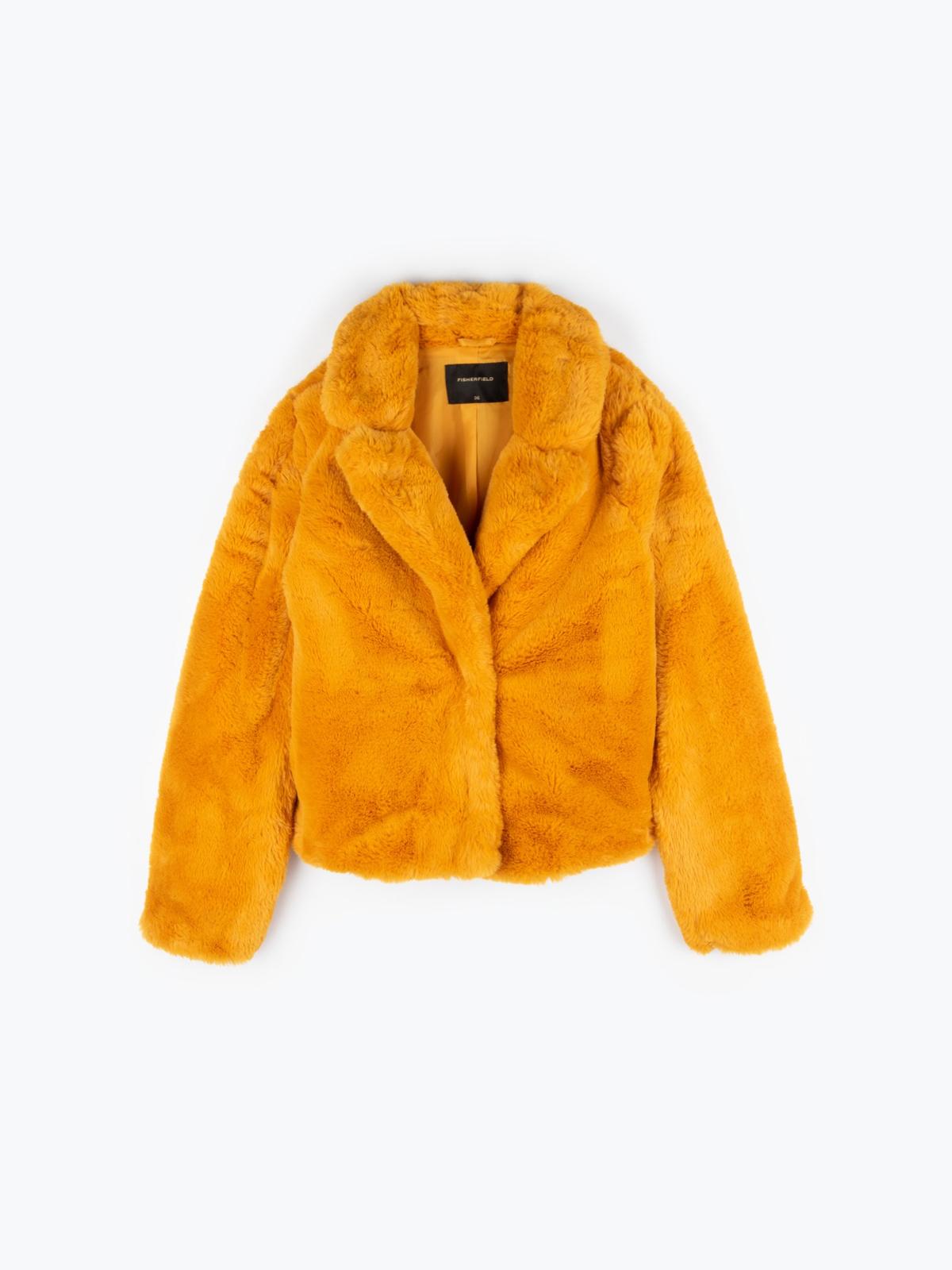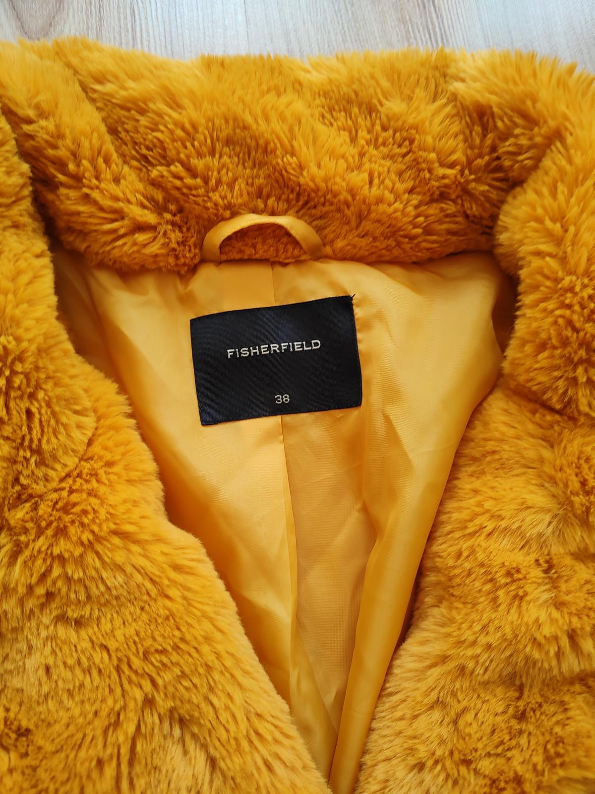 Krátky kabátik, kožušinový, s vreckami, v sýtej žltej, až horčičovej farbe. Žiarivý, určite zaujme :) s podšívkou, zapínanie na dva cvoky. Nosený málo, nepoškodený, perfektný stav. Veľkosť M, dĺžka 55cm, šírka 2x51cm, rukáv od ramena 61cm.