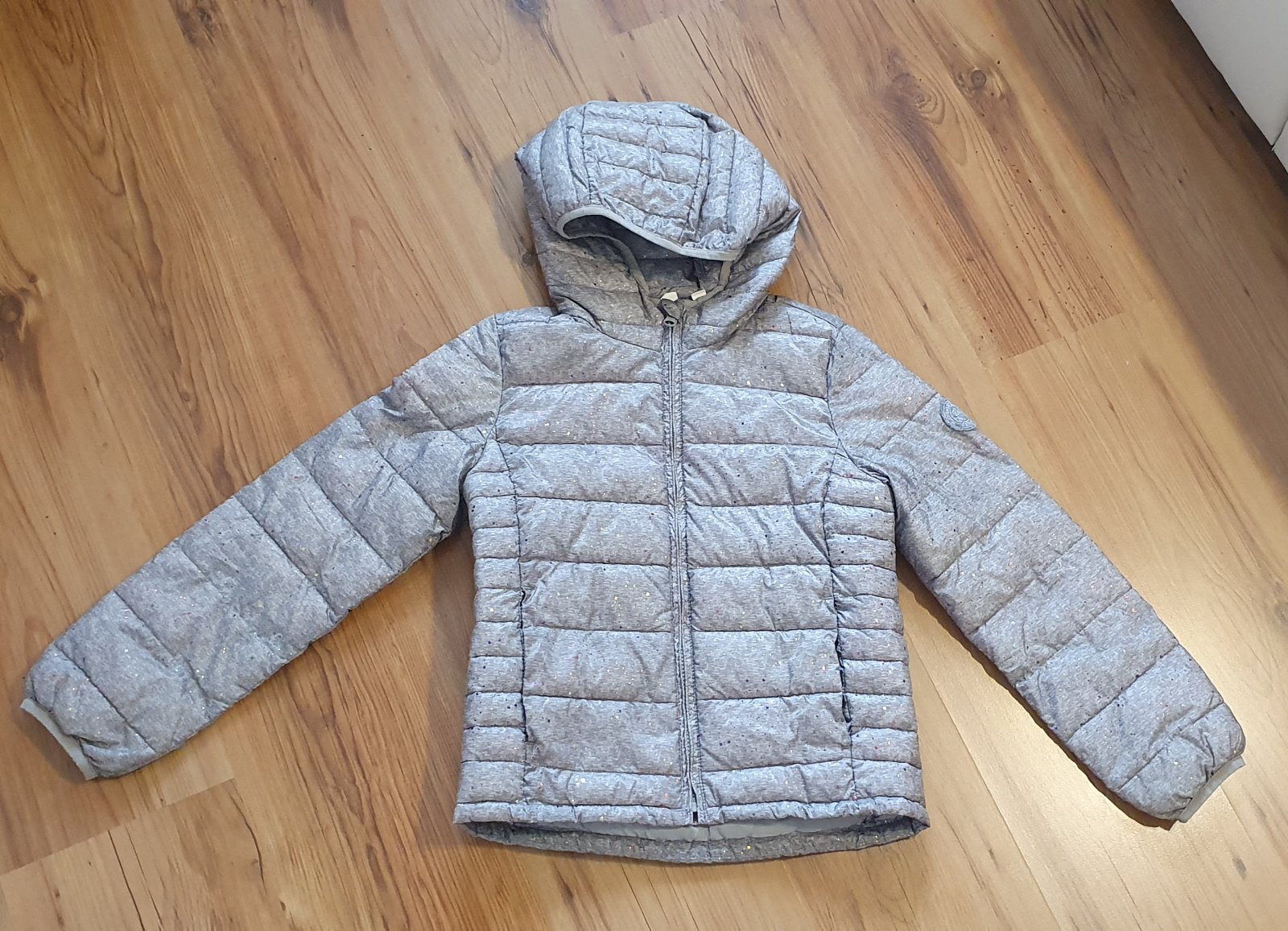 Pekna tenka bundicka s kapucnou vo velmi dobrom stave. Nie je ani podsita. ROZMERY: dlzka rukavu od goliera: 63cm, rukav od pleca: 53,5cm, celkova dlzka od pleca: 53cm, sirka pod pazuskami: 45cm