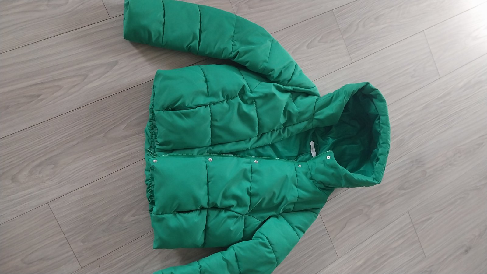 Oblečený raz , nádherná smaragdová zelená, ultra ľahký, plnený perím, kabát je ľahko, kov je zlatý,veľkosť 38,s. pod pazuchami 48 cm,d.86 cm