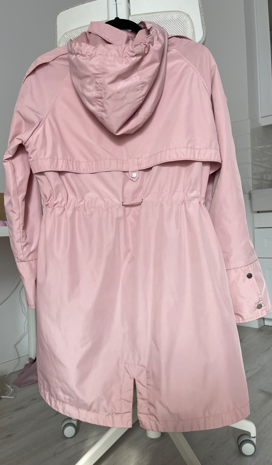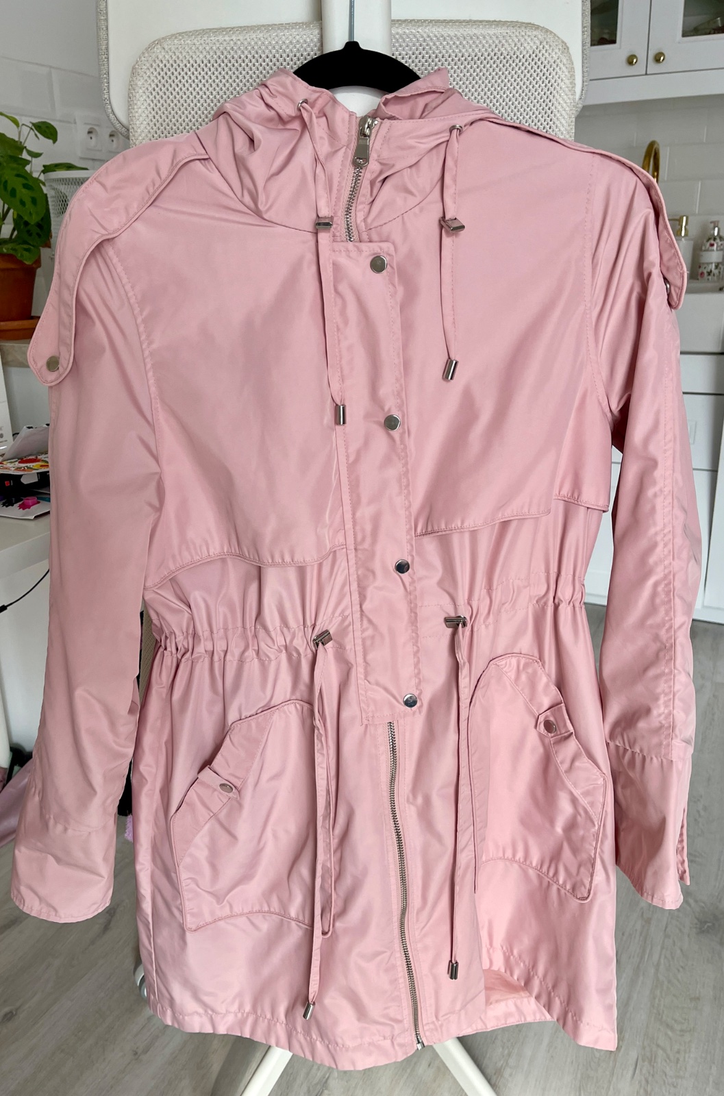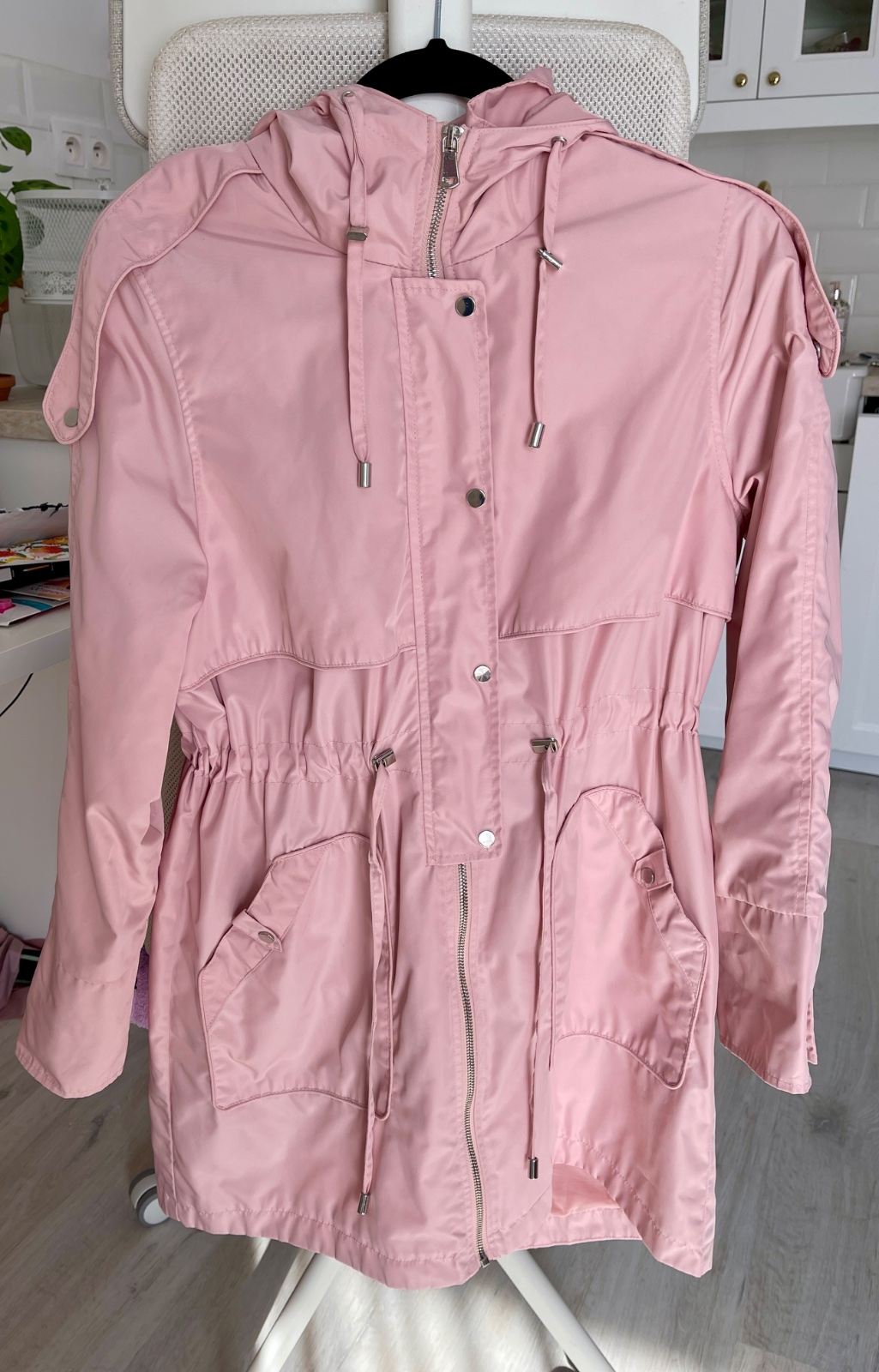 Bundička je podšitá, dá sa stiahnuť v páse. Má kapucňu, strieborné komponenty. Jediná vada je, že je trošku od makeupu z vnútornej strany, vidno na foto. Veľkosť 34, ale sedí aj na 36