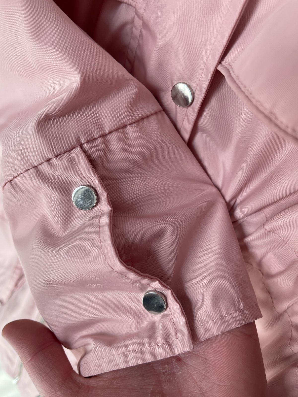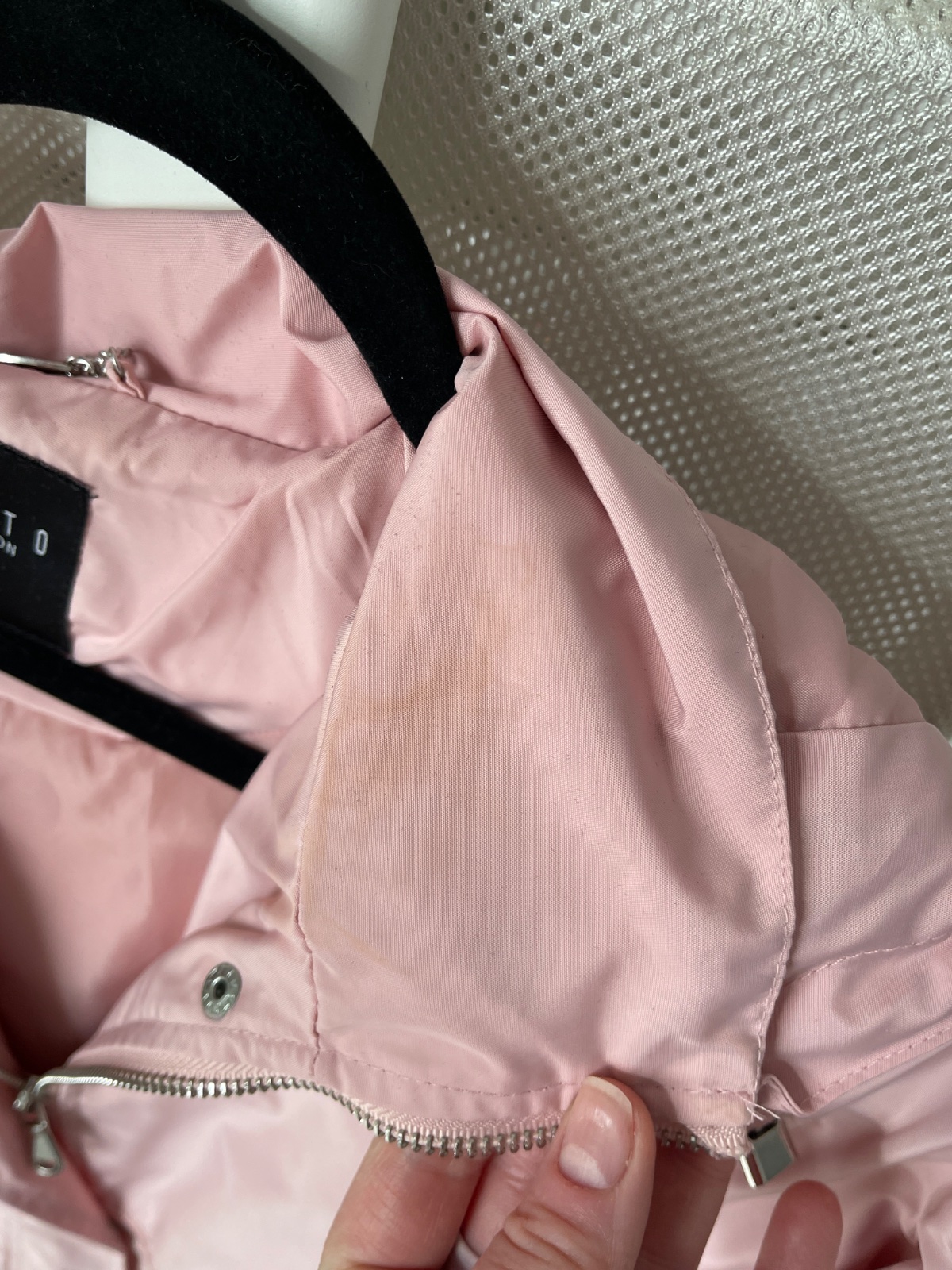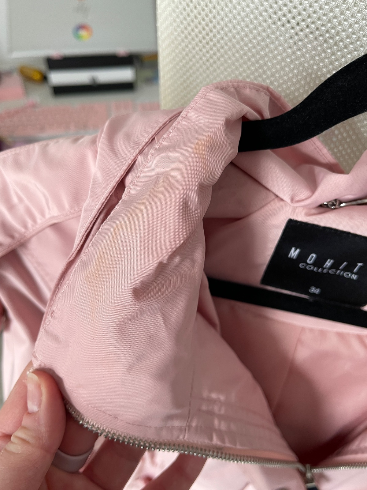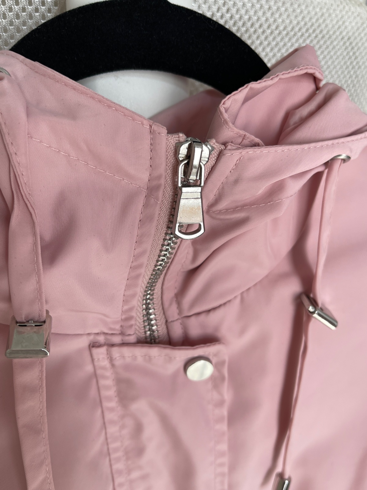 Bundička je podšitá, dá sa stiahnuť v páse. Má kapucňu, strieborné komponenty. Jediná vada je, že je trošku od makeupu z vnútornej strany, vidno na foto. Veľkosť 34, ale sedí aj na 36