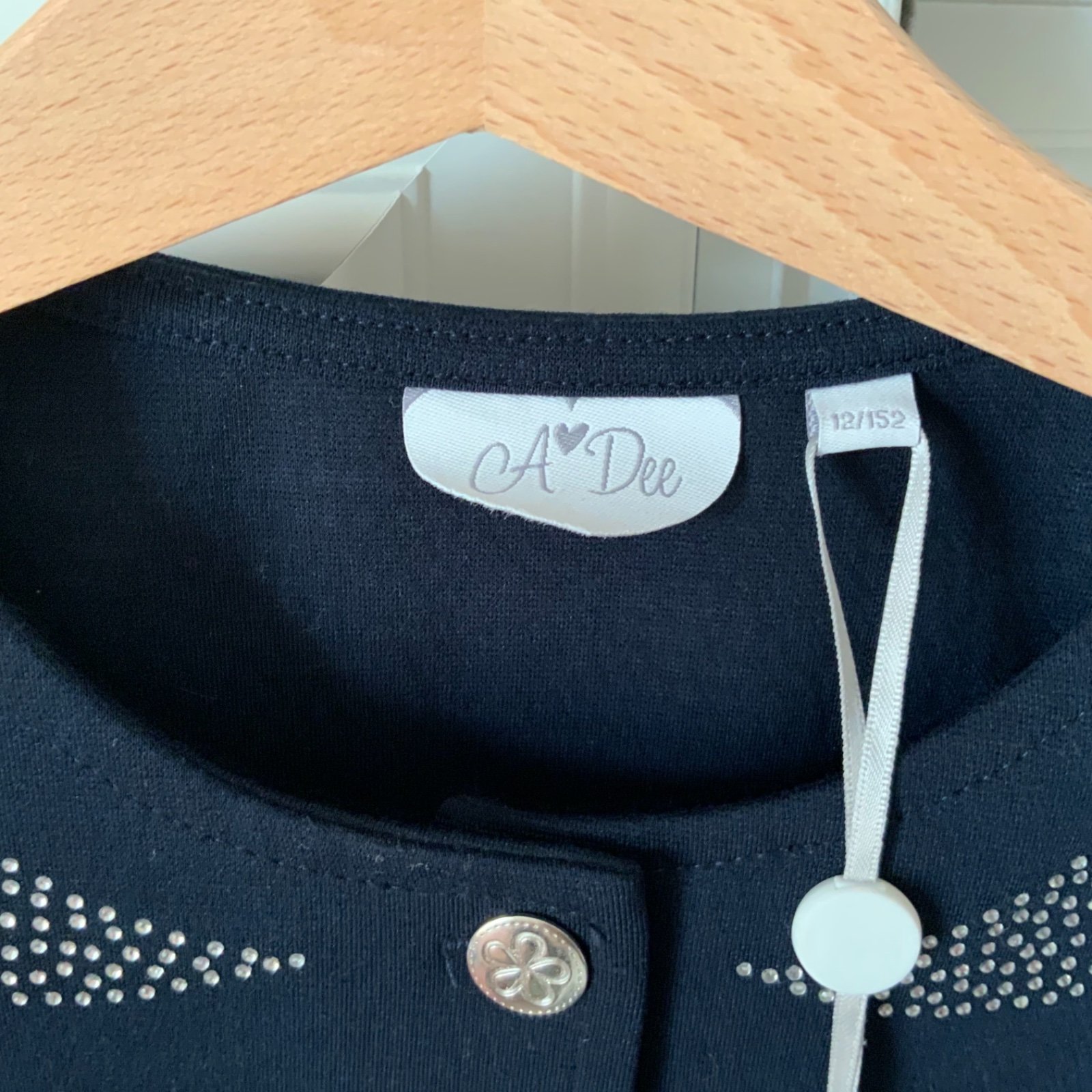 Krásny slávnostný kabátik A Dee č. 152, 12 rokov, Sedí skôr ako 140/146). Vzadu na chrbte na kamienkovej aplikácii chýba jeden kamienok, je tak už od kúpy (viď foto detail).