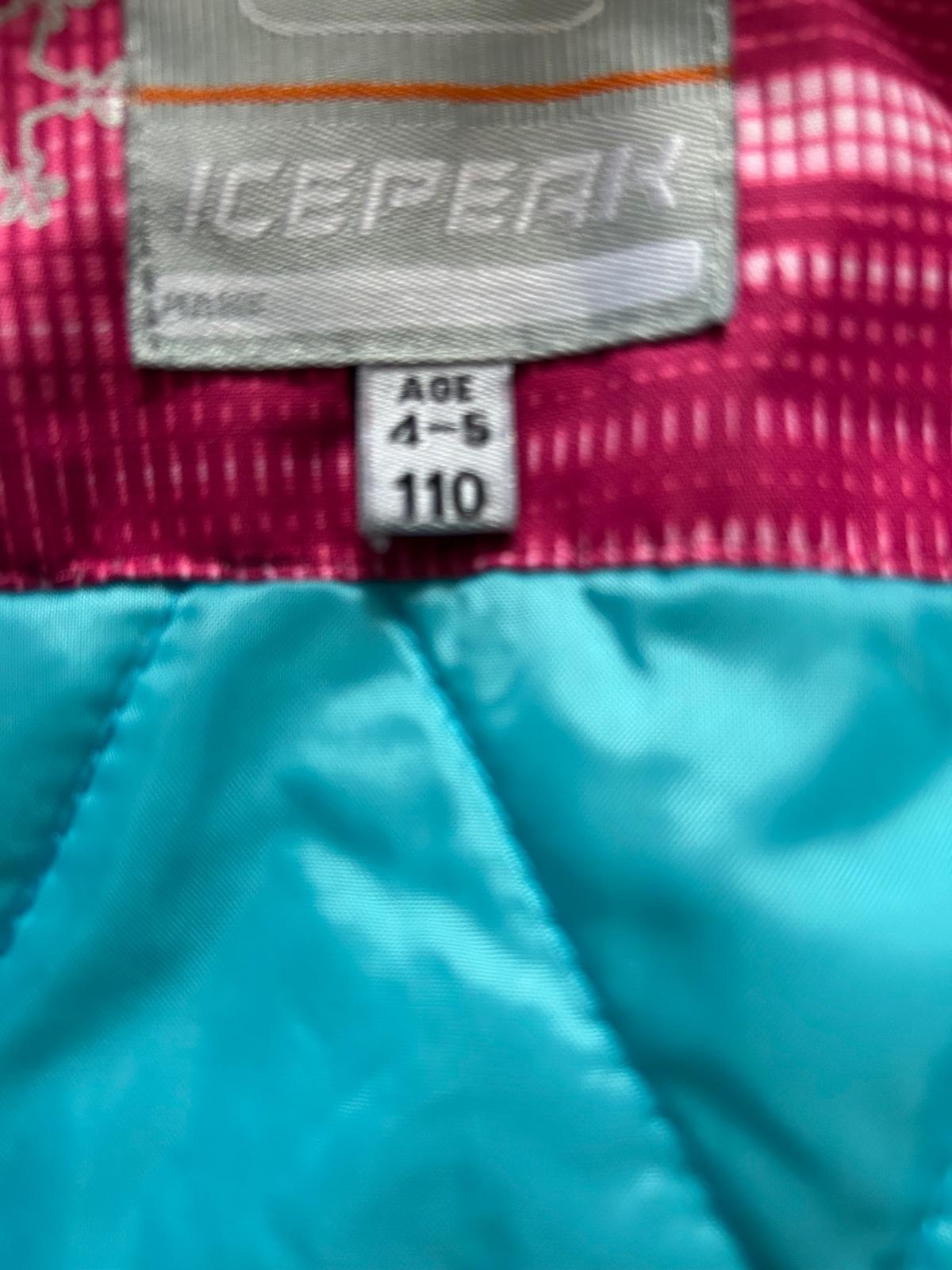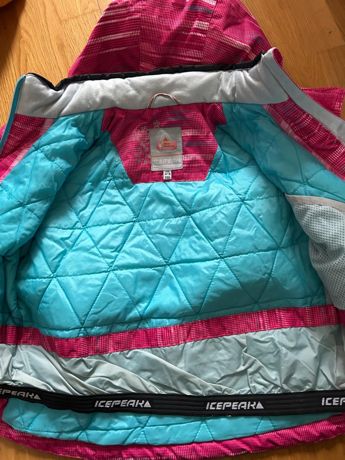 Dievcenska lyziarska bunda aj na bezne nosenie v zime. Velkost 110, ale je to skor velkost 116. Vyuzila predskolacka. Pouzivane 1 sezonu. Znacka ICEPEAK.