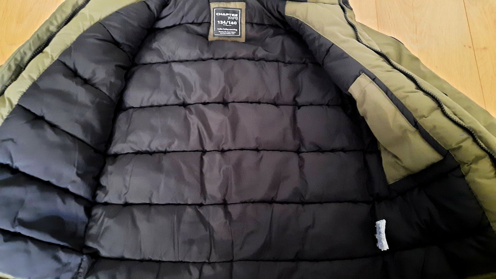 Nosená štýlová khaki zimná bunda v super stave, boli sme s ňou velmi spokojní. Veľkosť zodpovedá 134-140.