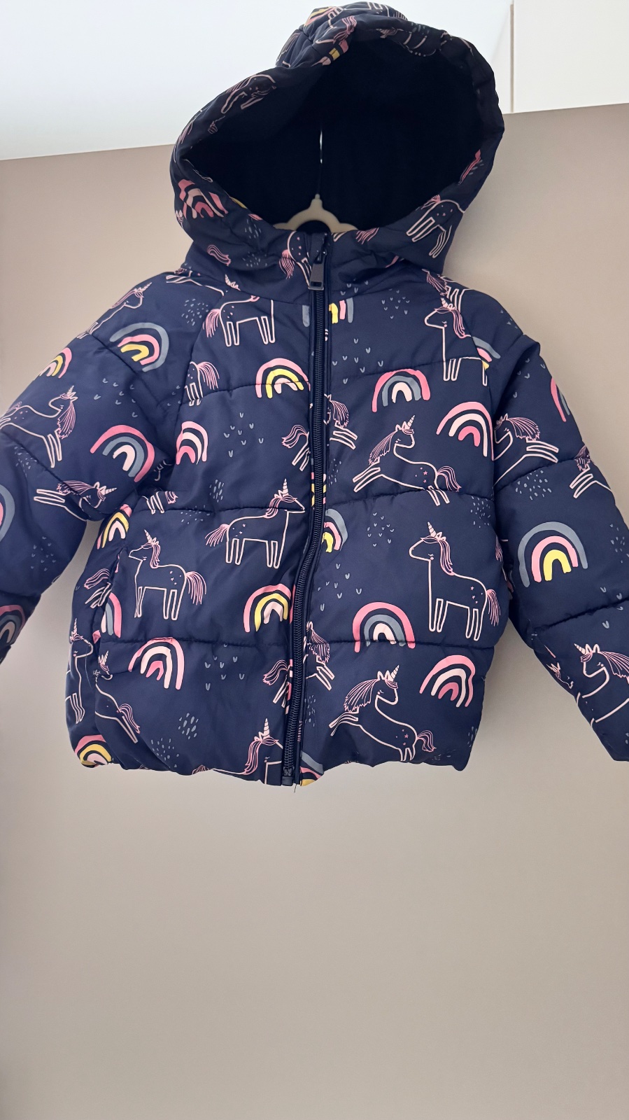 dievčenská zimná bunda bola nosená len jednu sezónu, vzor jednorožec je veľmi teplá zateplena, má 2 vrecka zapínanie na zips