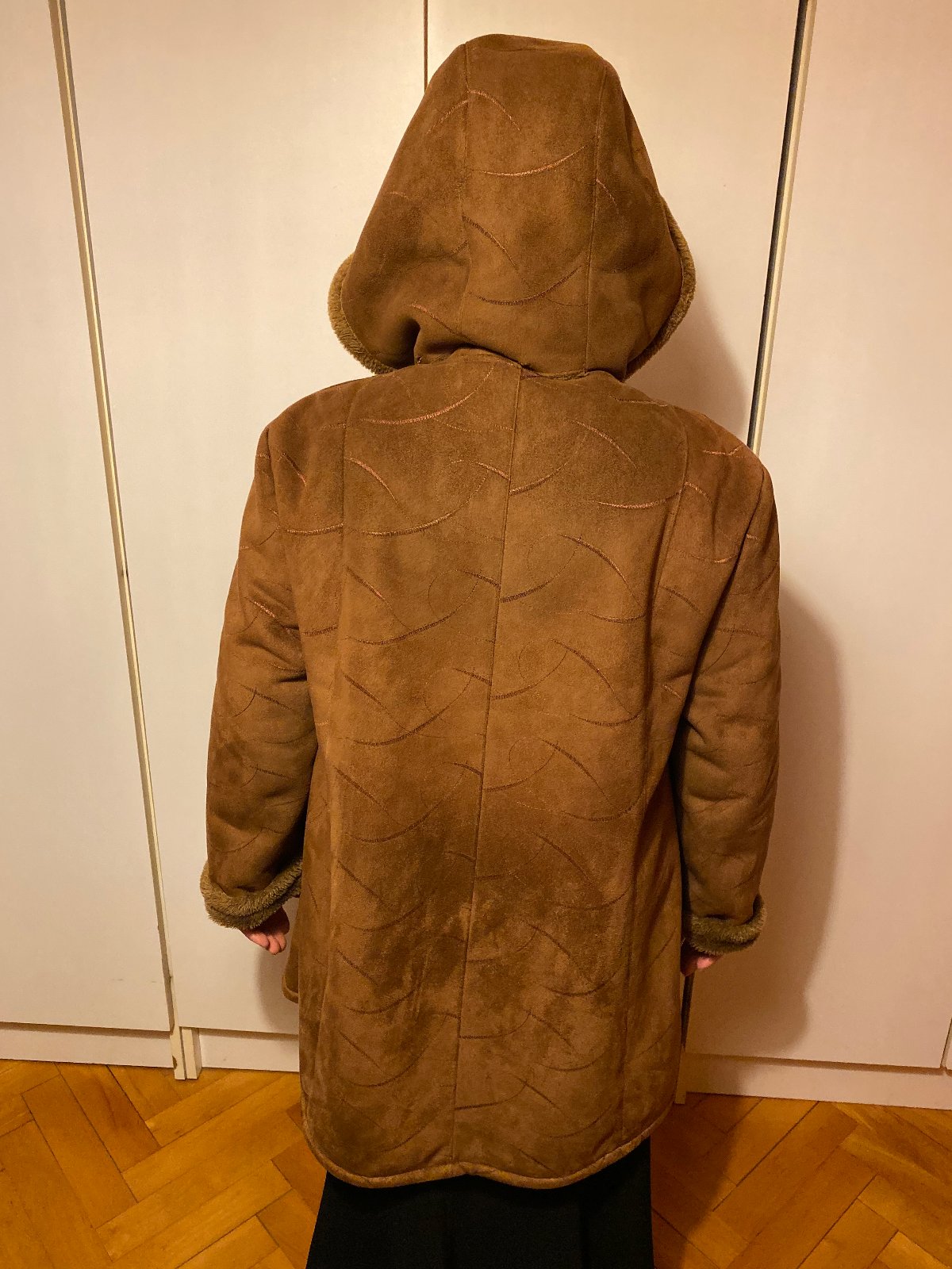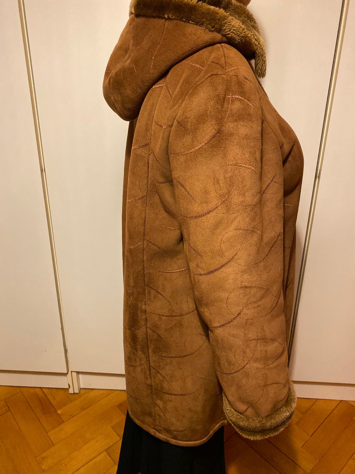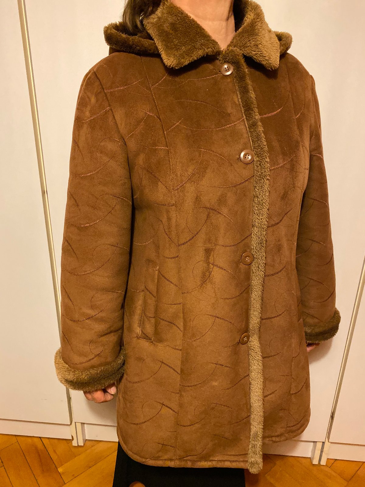 predám kožuštek z umelej kožušinky. Je veľmi ľahučky a teplý.Má odnímateľnú kapucňu. Strich je mierne do ačka, teda trošička dole rozšinený nie rovný alebo zúžený.Kožušinku má i na rukávov. Zapínanie na gombíčky.Veľmi zachovalý, ako nový.