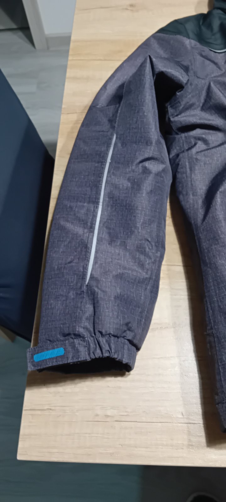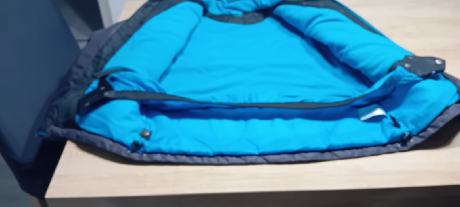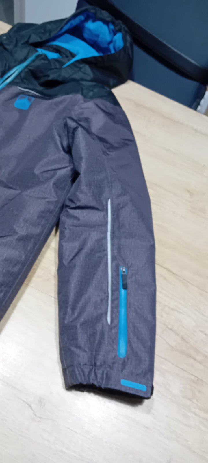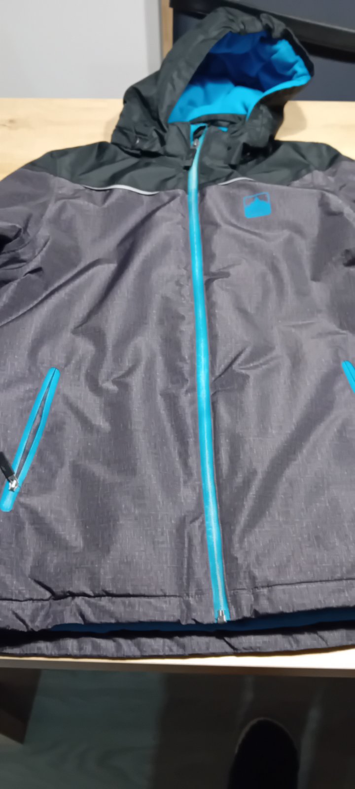 Krasna bunda s tyrkysovymi detailmi. Ma snezny pas, miesto na rukave na skipas reflexne prvky,kapucnu. Syn ju mal tyzden na lyziarskom vycviku