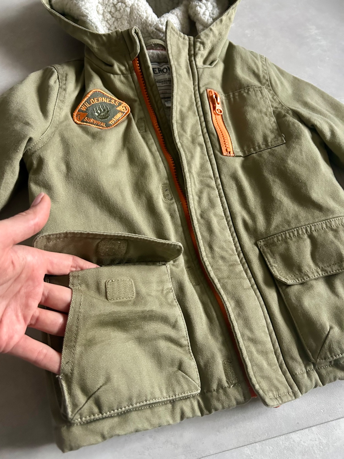 Zimná bunda - kabát - krátko nosený, kúpili sme ho malý:( krásny teplý - khaki - krásna farba, oranžový zips. 4-5 rokov 104-110. ❣️pozri moje inzeráty❣️