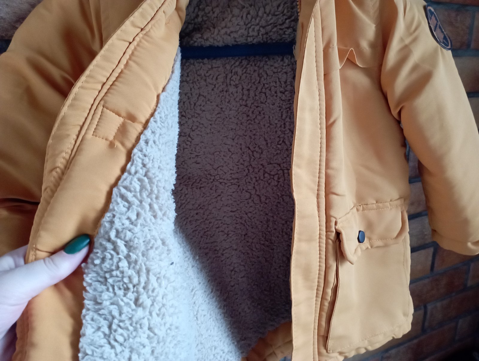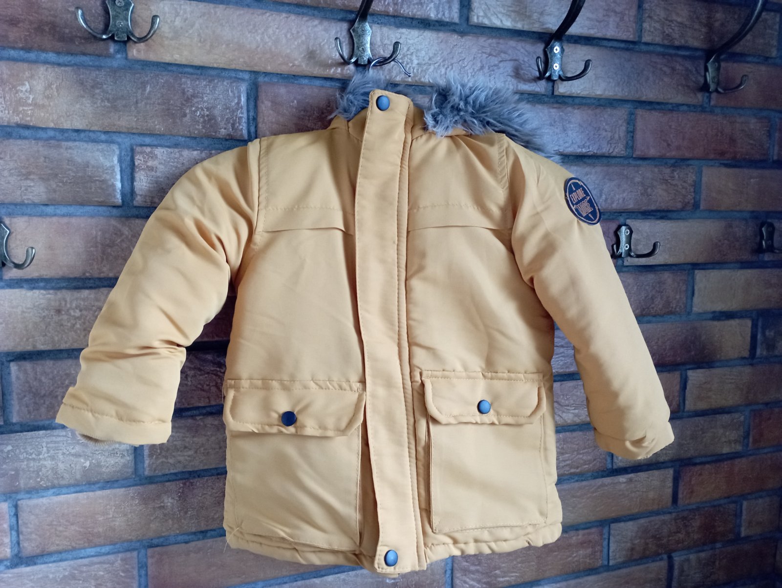 Predám nosenu, no nepoškodenu teplu zimnú bundu horcicovej farby s kapucňou ,veľ 110/116