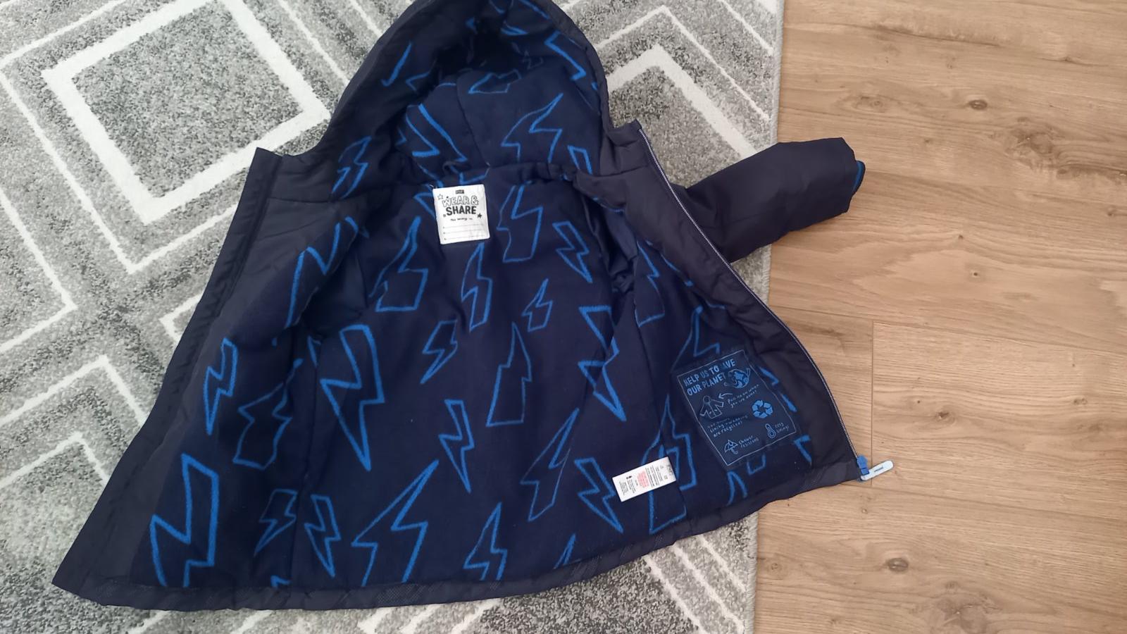 Pekný noseny stav, vo vnútri ovečka. Kožušina na kapucni stále pekná. Veľkosť písaná 122 ale je menšia, treba sa riadiť rozmermi. Preto uvádzam 116. Verím že ešte niekomu poslúži a mne sa uvoľní ...