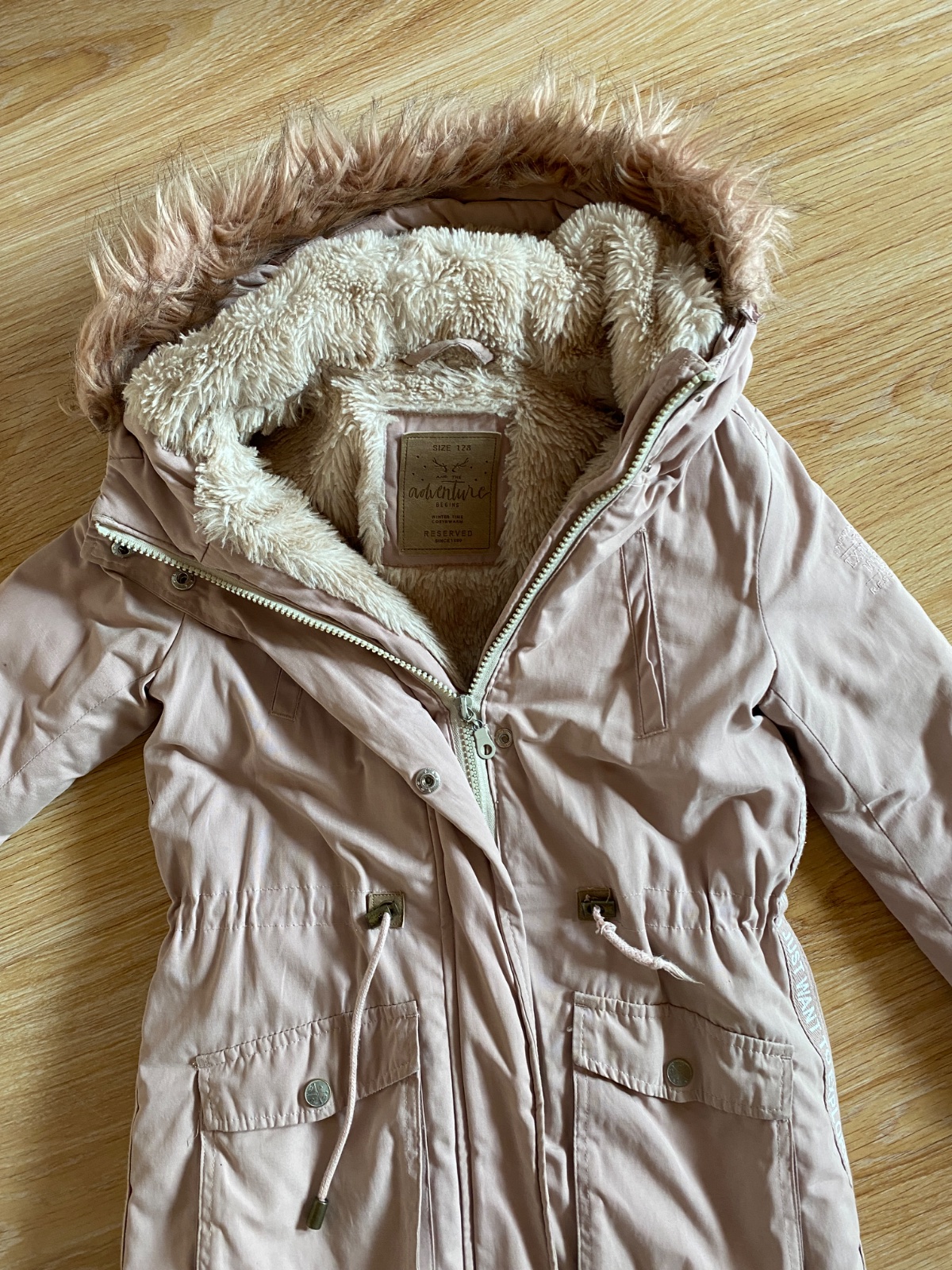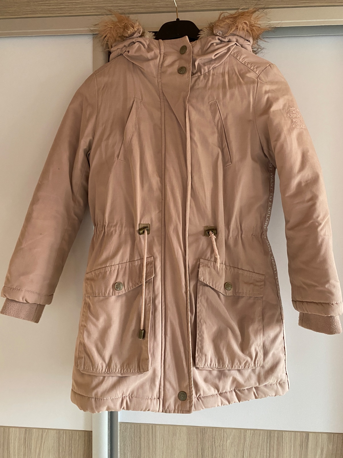 Predám nosenú bundu na zimu vo výbornom stave. Na bokoch je bunda zdobená nápismi ako vidno na foto. Na konci šnúrky chýba koncovka, no šnúrka sa dá vymeniť. Kožušina na kapucni sa dá odpojiť.