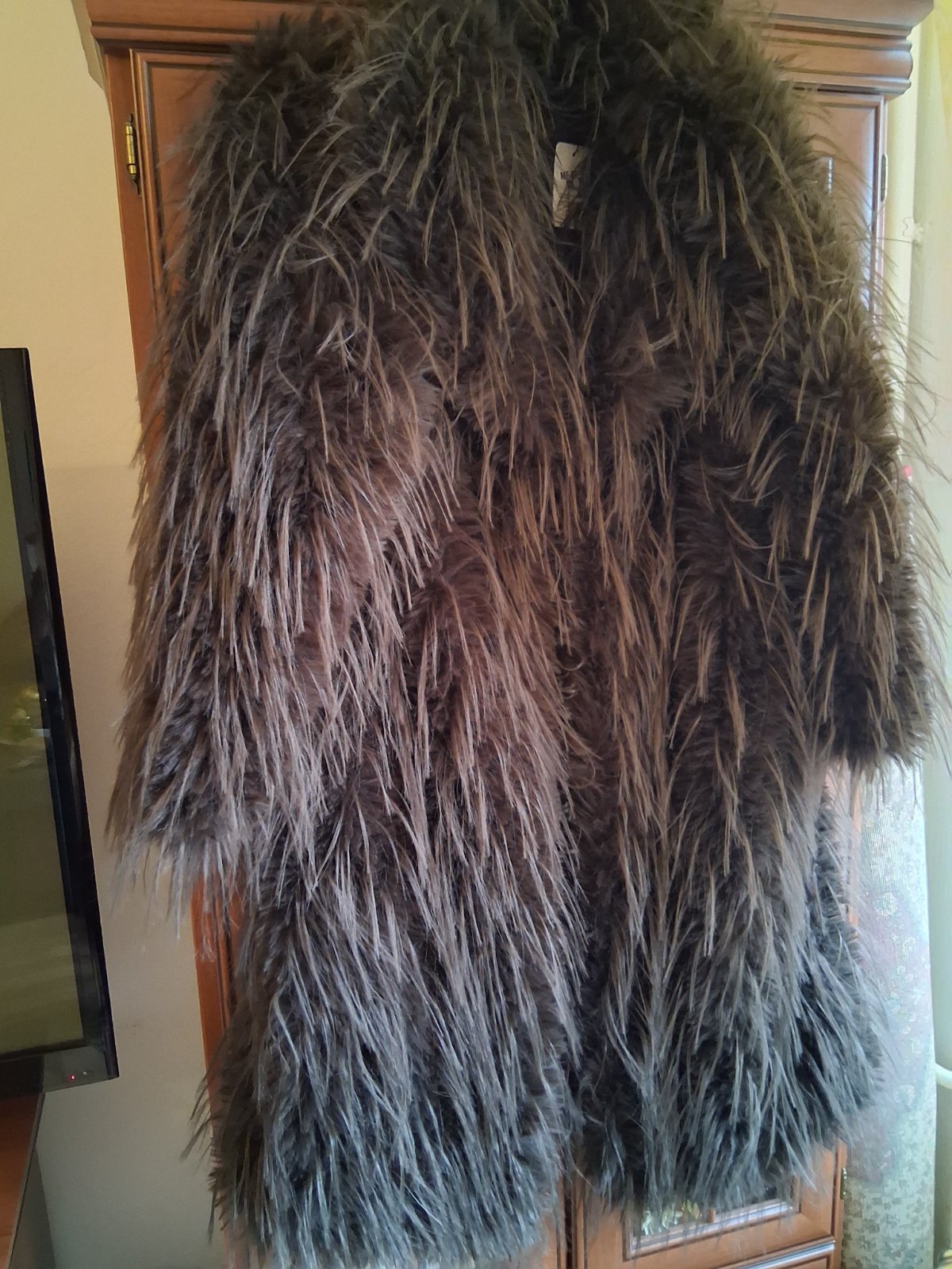 Teplý kožúšok z umelej kožušiny s kapucňou, zapínaním na cvoky a opaskom. Úplne nový s visačkou.